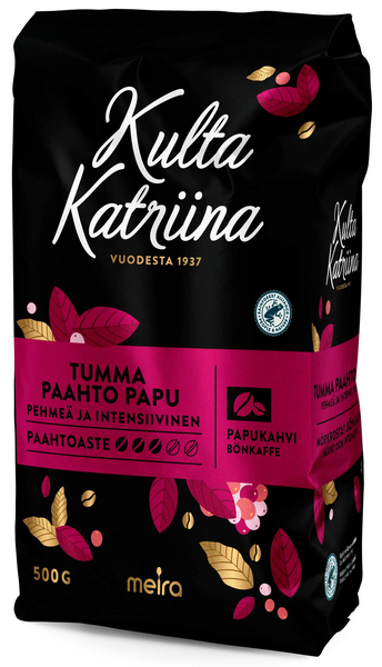 Kulta Katriina Tumma Paahto on aidosti tummapaahtoinen kahvi, jonka ammattitaidolla hiottu resepti sisältää maailman parhaita kahvilajikkeita. Paahtoaste 3 vähentää kahvin hapokkuutta ja tuo esiin uusia aromeja. Kulta Katriina Tumma Paahto kahvin maku on pehmeä ja intensiivinen, ja se on jälkimaultaan tumman suklainen. Tämän vahva-aromisen ja täyteläisen kahvin pavut tulevat Väli-ja Etelä-Amerikasta sekä Itä-Afrikasta.