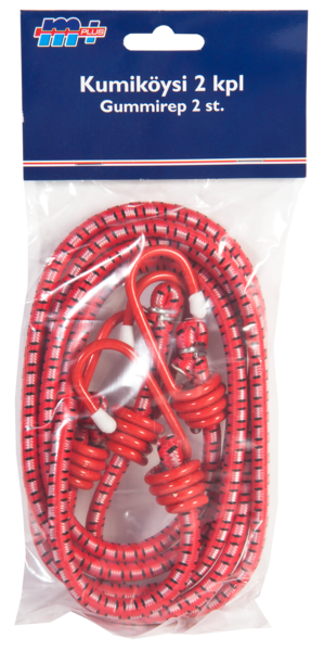 Kuorman kiinnittämiseen ja sitomiseen. UV-valon kestävä kumiköysipari, jossa muovipäällysteiset koukut.