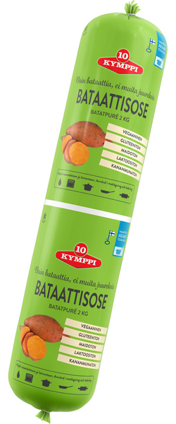 VegaaninenKymppi Batattisoseessa on makaehko maku ja sileä rakenne. Valmistuksessa käytetään vain bataattia. Raakapakastettu käyttövalmis juuressose on helppo tapa lisätä kasvisten käyttöä ruoanvalmistuksessa ja leivonnassa. Sopii uuniruokiin, keittoihin ja leivontaan. Kypsennys ohjeen mukaan. Avainlippu -tuote. Gluteeniton, vegaaninen.