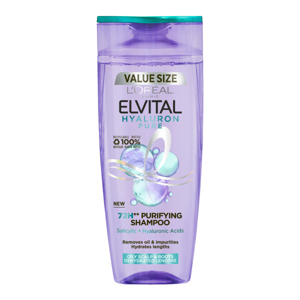 L'Oréal Paris Elvital, Hyaluron Pure -shampoo rasvoittuvalle hiuspohjalle ja kuiville pituuksille.Puhdistaa hiuksista lian ja hien häiritsemättä