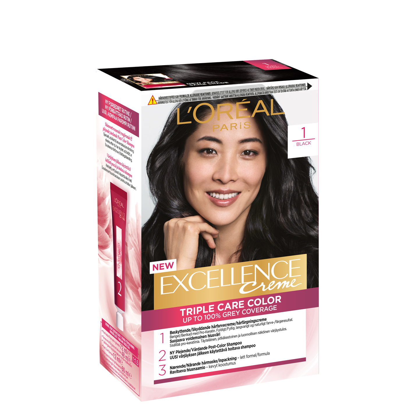 Uusi Triple Care Color peittää harmaat 100%:sti. SUOJAAVA VÄRIVOIDE sisältää pro-keratiinia ja suojaavaa seerumia. Suojaa hiuksia värjäyksen aikana. Täyteläinen, luonnollisen näköinen värjäystulos. UUSI RUTIINI: Värjäyksen jälkeen käytettävä hoitava shampoo puhdistaa hellästi loput tuotteesta hiuspohjasta ja hiuksista. UUSI KOOSTUMUS: Ravitseva hiusnaamio, joka sisältää keramideja. Kevyt koostumus, joka ravitsee hiuksia pitkäkestoisesti niitä latistamatta. Silottaa hiuksia tuoden kiillon esiin. Uusi raikas tuoksu. Noudata pakkauksen käyttöohjeita.