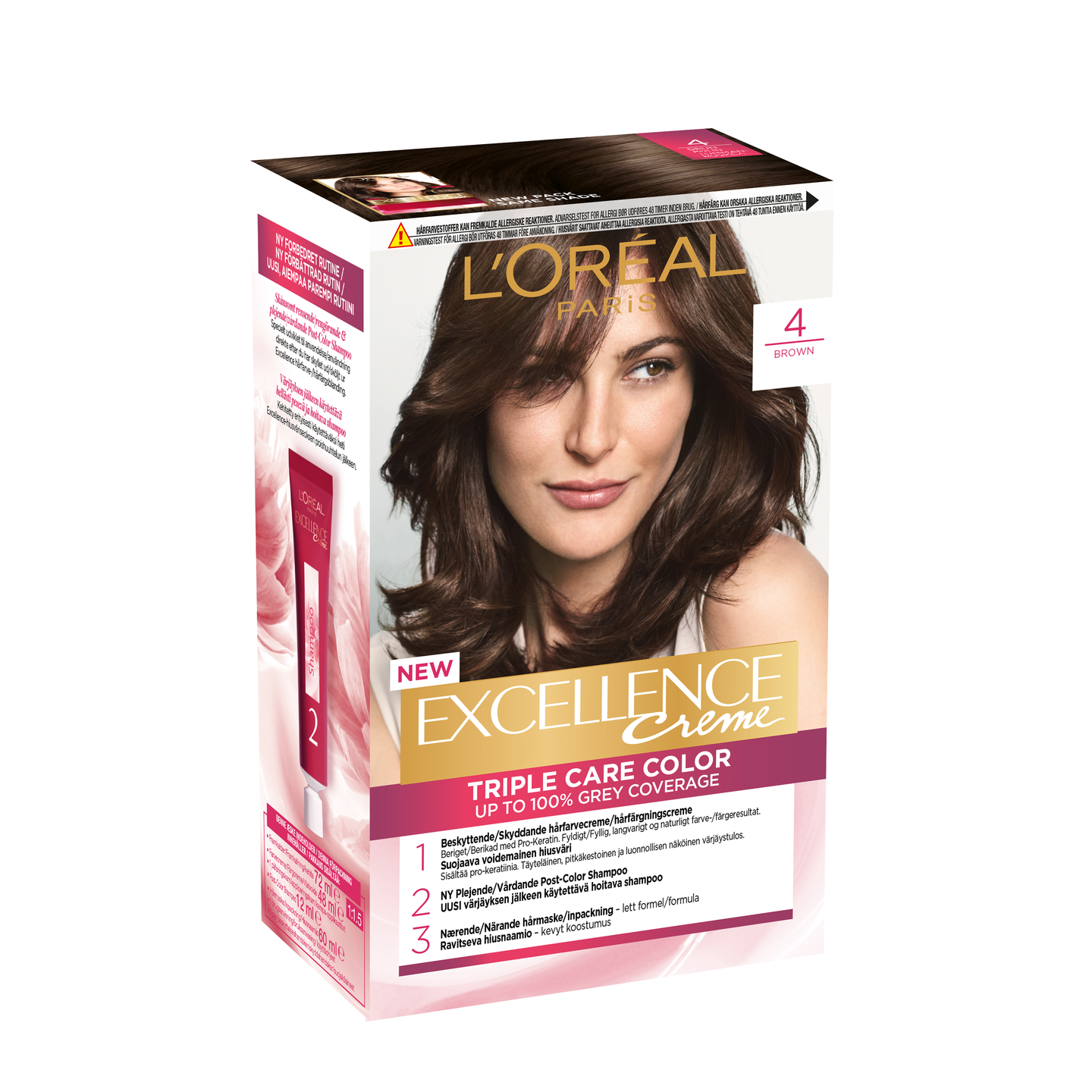 Uusi Triple Care Color peittää harmaat 100%:sti. SUOJAAVA VÄRIVOIDE sisältää pro-keratiinia ja suojaavaa seerumia. Suojaa hiuksia värjäyksen aikana. Täyteläinen, luonnollisen näköinen värjäystulos. UUSI RUTIINI: Värjäyksen jälkeen käytettävä hoitava shampoo puhdistaa hellästi loput tuotteesta hiuspohjasta ja hiuksista. UUSI KOOSTUMUS: Ravitseva hiusnaamio, joka sisältää keramideja. Kevyt koostumus, joka ravitsee hiuksia pitkäkestoisesti niitä latistamatta. Silottaa hiuksia tuoden kiillon esiin. Uusi raikas tuoksu. Noudata pakkauksen käyttöohjeita.