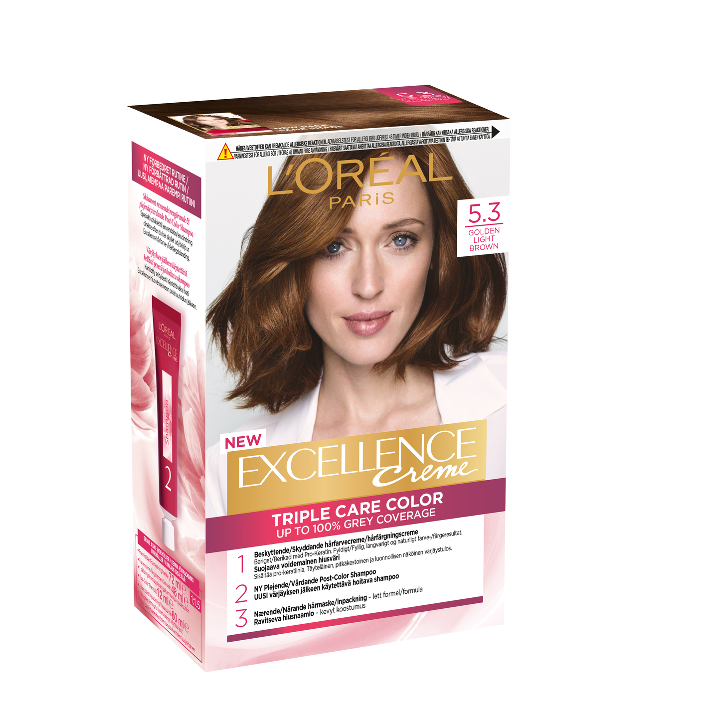 Uusi Triple Care Color peittää harmaat 100%:sti. SUOJAAVA VÄRIVOIDE sisältää pro-keratiinia ja suojaavaa seerumia. Suojaa hiuksia värjäyksen aikana. Täyteläinen, luonnollisen näköinen värjäystulos. UUSI RUTIINI: Värjäyksen jälkeen käytettävä hoitava shampoo puhdistaa hellästi loput tuotteesta hiuspohjasta ja hiuksista. UUSI KOOSTUMUS: Ravitseva hiusnaamio, joka sisältää keramideja. Kevyt koostumus, joka ravitsee hiuksia pitkäkestoisesti niitä latistamatta. Silottaa hiuksia tuoden kiillon esiin. Uusi raikas tuoksu. Noudata pakkauksen käyttöohjeita.