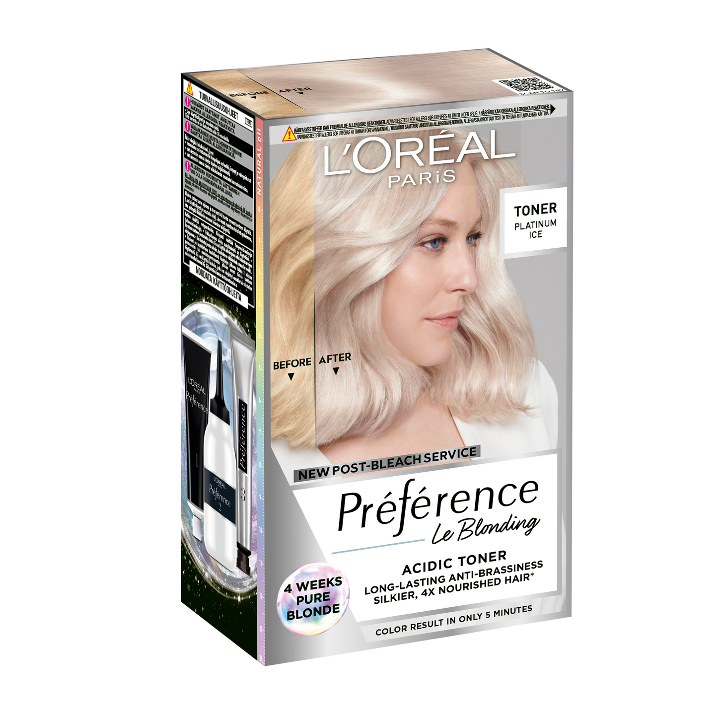 L'Oréal Paris Préférence -sävytys täydentää vaalennusrutiinisi. Le Blonding Platinum Ice -sävytys neutraloi vaalennettujen hiusten lämpimiä sävyjä ja antaa kirkkaan vaalean hiusvärin. Koostumus ehkäisee keltaisia ja oransseja vivahteita hiuksissa jopa 4 viikon ajan* ja tekee hiuksistasi silkinpehmeät sekä 4X ravitummat. Préférence Le Blonding -sävytyksen ammoniakiton koostumus palauttaa hiusten pH-arvon sen luonnolliselle tasolle vain 5 minuutissa. - Neutraloi lämpimiä vivahteita - Ehkäisee keltaisia ja oransseja vivahteita hiuksissa jopa 4 viikon ajan* - Tekee hiuslaadusta näkyvästi paremman - Palauttaa hiusten pH-arvon - Ilman ammoniakkia - Pakkaus sisältää: 1 sävytysvoide, kehite, 1 vahvistava hoitoaine, 1 pari suojakäsineitä + käyttöohjeet * Mittaustulos, sävytys+ vahvistava hoitoaine