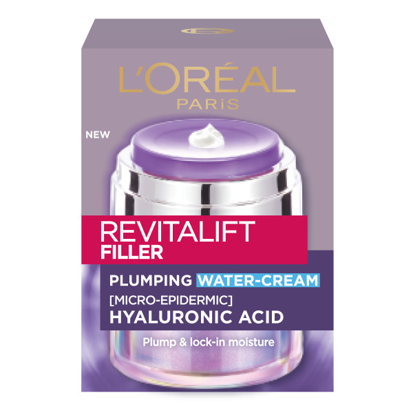 Revitalift Filler Plumping Water-Cream -kasvovoiteen kevyt, tahmaamaton koostumus sisältää hyaluronihappoa ja se täyttää ihoa kosteudella ja vähentää näkyvästi ryppyjä. Voide antaa iholle intensiivisesti kosteutta ja imeytyy nopeasti eikä jätä iholle rasvaista tunnetta. Sopii kaikille ihotyypeillemyös herkälle iholle.