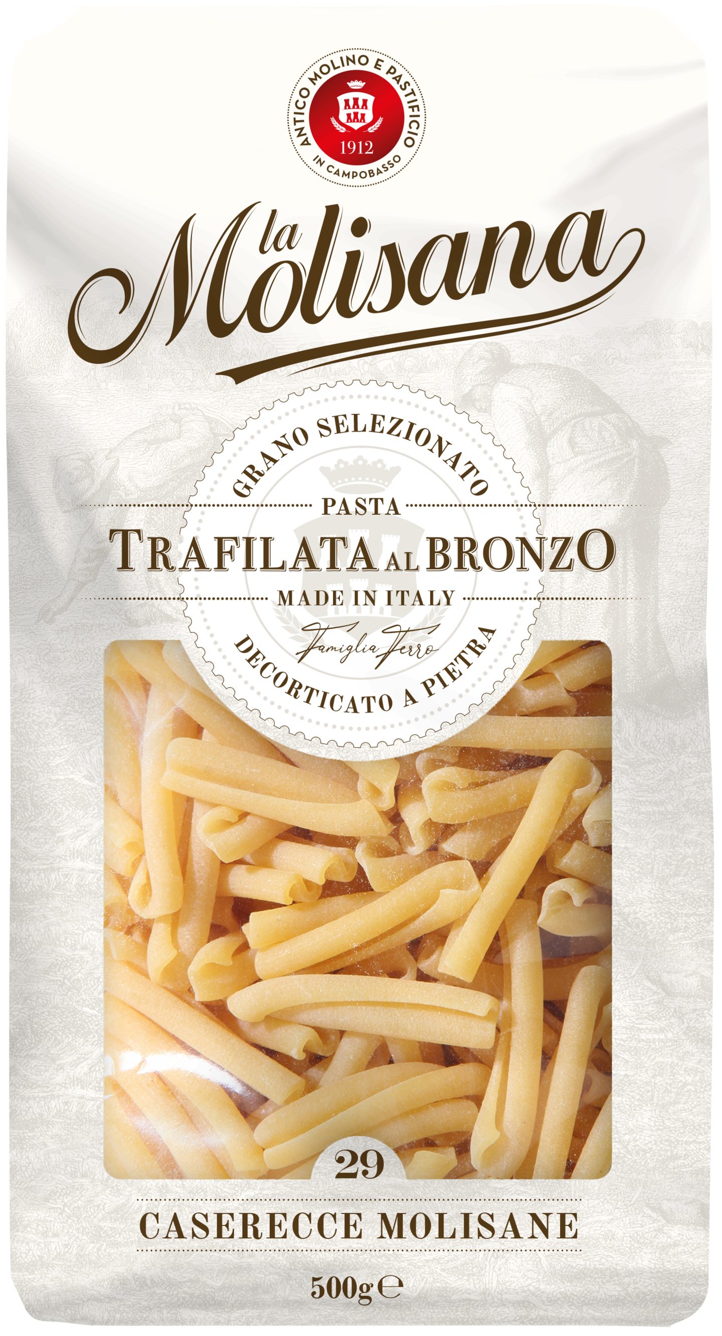 Aito italialainen durumpasta. Laadukkaan La Molisana pastan korkea gluteenipitoisuus takaa, että pasta kestää hyvin keittämistä ja se on aina ”al dente”. La Molisana pastan valmistukseen on käytetty tarkoin valikoitua viljaa ja raikasta vuoristovettä. La Molisana pasta valmistetaan pronssisilla valumuoteilla, jotka tekevät pastaan karhean pinnan – tämä parantaa kastikkeiden tarttumista pastan pintaan ja pasta maistuu entistäkin paremmalta. La Molisana caserecce molisanen muoto sopii hyvin esim. pastasalaattiin sen erilaisen kierteisen muodon puolesta. Maista ja nauti.