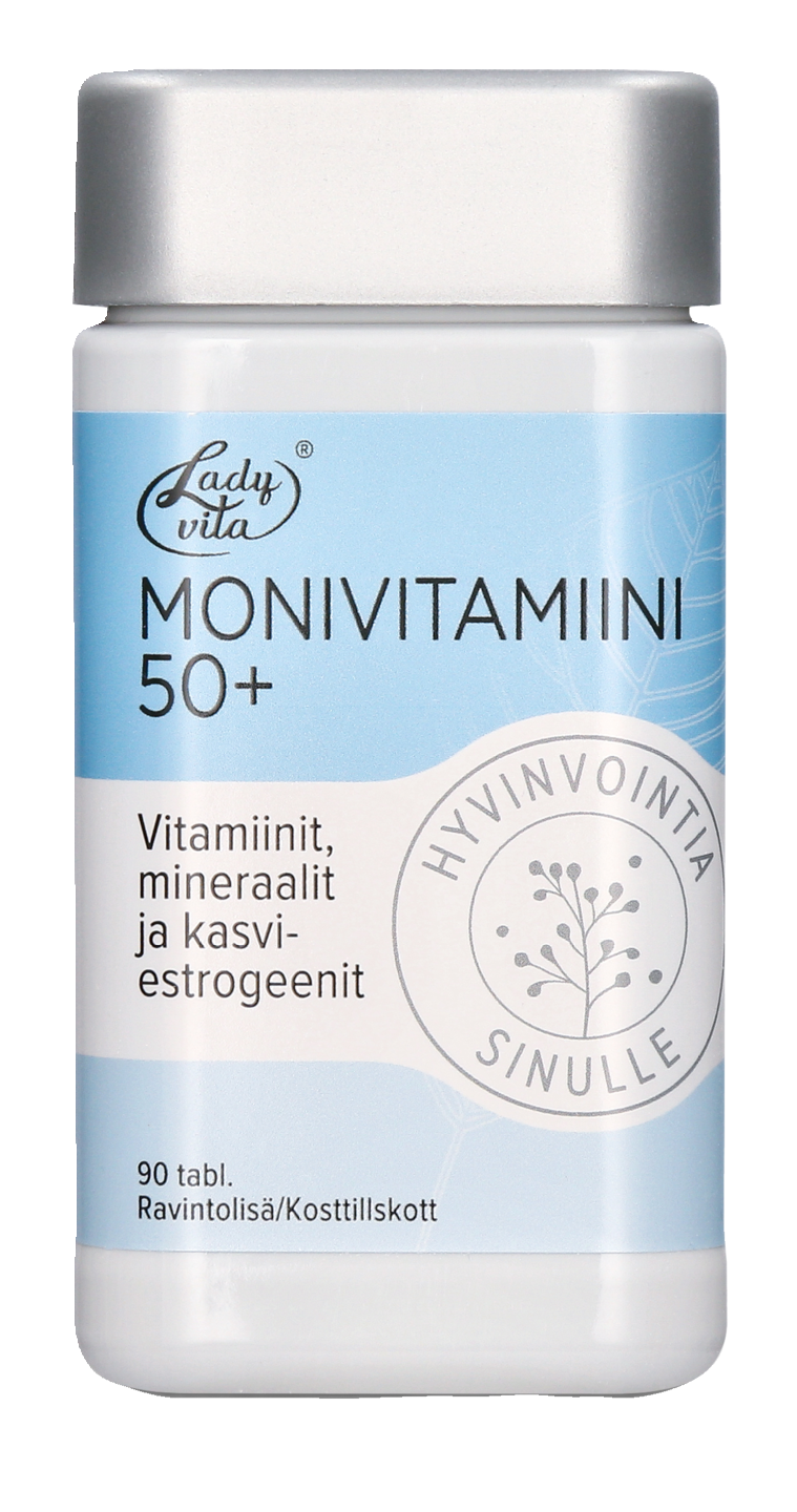 Ladyvita 50+ monivitamiini sisältää kasviestrogeeneja sekä 13 vitamiinia ja 9 kivennäisainetta, kuten kalsiumia ja D-vitamiinia, joiden tarve iän myötä lisääntyy. Ladyvita 50+ sisältää täydellisesti juuri sen, mitä elimistö tässä elämänvaiheessa tarvitsee. Kalsium ja D-vitamiini edistävät luuston pysymistä normaalina. Vuorokausiannos 3 tablettia. Ravintolisä ei korvaa monipuolista ja tasapainoista ruokavaliota eikä terveitä elämäntapoja.