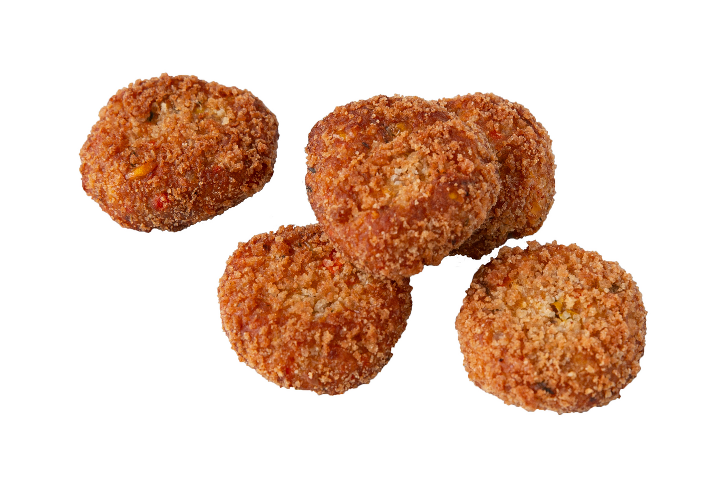 Keltainen herne, porkkana, maissi, peruna, gluteeniton leivitysaine (riisijauho, peruna- ja tapiokatärkkelys, rypsiöljy, dekstroosi, sokeri, hiiva, suola, maissitärkkelys, psylliumkuitu), rapsiöljy, herneproteiini, sipuli, suola, ruokosokeri, stabilointiaine (E461), mausteet (paprika, juustokumina, mustapippuri, oregano, timjami, cayenne, chili, valkosipuli). Kasvispitoisuus 92 %.