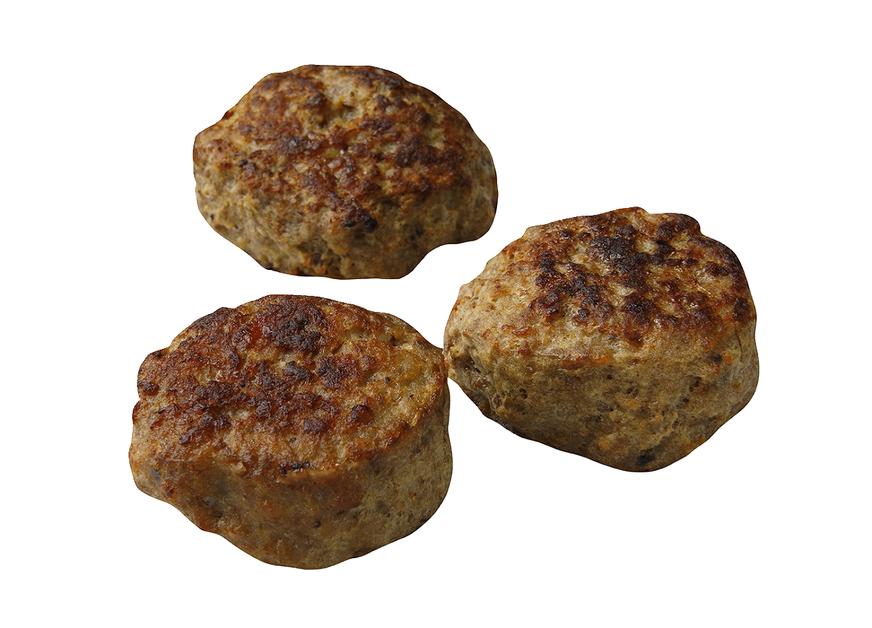 Naudanliha 64 %, peruna, sipuli, KANANMUNA, perunajauho, vesi, suola, musta-, mauste- ja valkopippuri, rapsiöljy, laktoositon VOI (KERMA, suola).