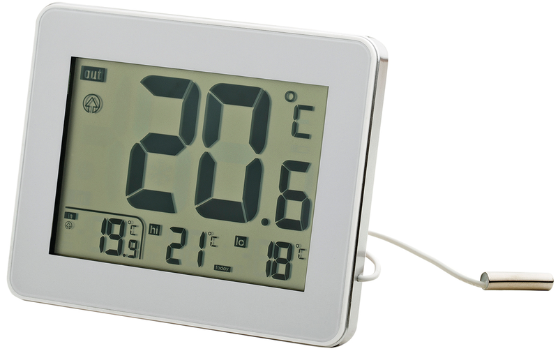 Tyylikkäästi muotoiltu digitaalinen lämpömittari isolla näytöllä. Voit valita kumpi näkyy isoilla numeroilla, ulko- vai sisälämpötila. Näytön oikeaan alakulmaan voidaan valita näkymään maksimi- ja minimilämpötilat tai kello. Mittausalue: sisälämpötila 0..+50 °C, ulkolämpötila -40..+70 °C. Seinä- tai pöytäasennus. Paristo CR2025 ei kuulu mukaan.