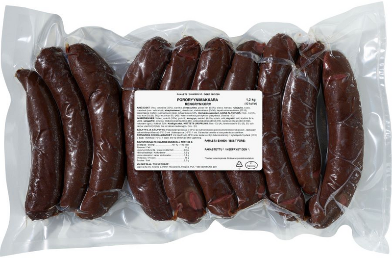 Vesi, poronliha (33%), sianliha, OHRAsuurimo, poronveri (6,6%), silava, kamara, RUISjauho, suola, mausteet (mm. valkosipuli, SINAPINsiemen), dekstroosi, stabilointiaine (E450), hapettumisenestoaine (E316), säilöntäaine (E250). Luonnonsuoli (sika).