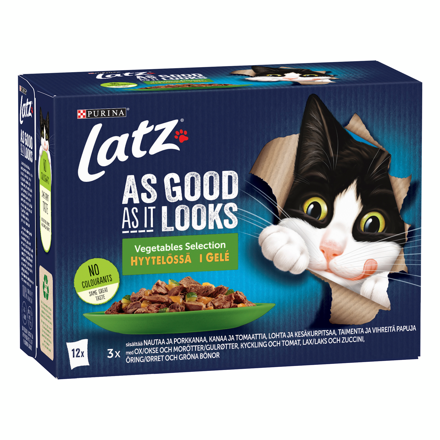LATZ As Good As It Looks -tuotesarjaan kuuluu vastustamattomia kasviksia sisältäviä aterioita, jotka näyttävät, tuoksuvat ja maistuvat yhtä herkullisilta kuin itse tehdyt! Jokainen laadukkaista aineksista valmistettu resepti sisältää mureita paloja mehevässä hyytelössä luoden herkkulisen aterian, jota kissasi rakastaa! LATZ As Good As It Looks -sarjaan kuuluu useita eri makuvaihtoehtoja herkullisessa hyytelössä ja ne tyydyttävät kissasi vaihtelunhalun joka päivä. Ne todellakin maistuvat aivan yhtä hyvältä kuin näyttävät! LATZ on yksinkertaisesti vastustamaton!