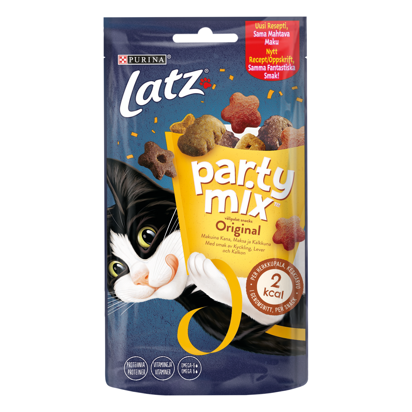Latz Party Mix -uutuuden ansiosta voit viettää aiempaa useammin hauskoja yhteisiä hetkiä kissasi kanssa. Sekoitus sisältää vastustamattoman ja värikkään yhdistelmän lihaisia herkkuja, joissa yhdistyvät houkuttelevat tuoksut, herkulliset maut ja miellyttävä koostumus. Eikä siinä kaikki! Purina Party Mix sisältää proteiineja, vitamiineja ja omega-6-rasvahappoja, jotka auttavat kissaasi pysymään terveenä ja onnellisena. Purina Party Mix -valikoimassa on useita eri vaihtoehtoja kissasi tarpeisiin. Kokeile jännittäviä vaihtoehtoja jo tänään!