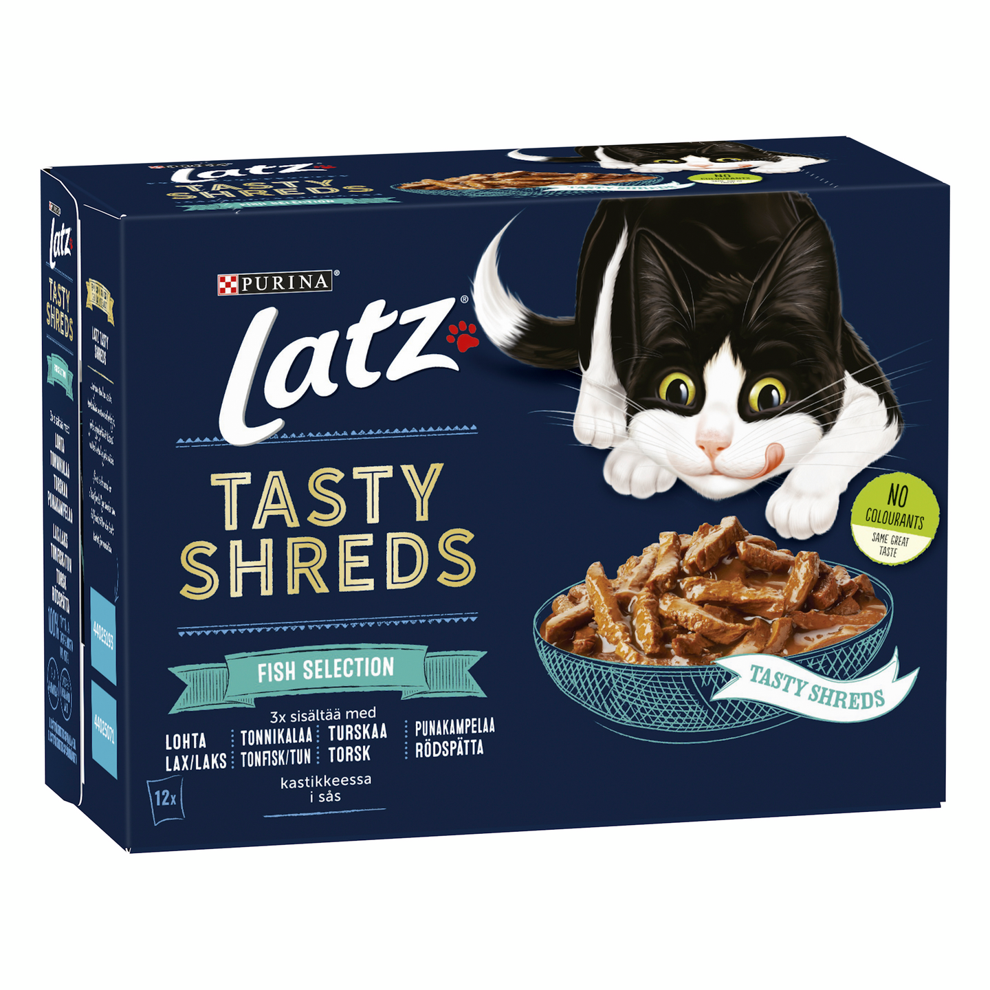"LATZ® Tasty Shreds ovat mureita ja vastustamattoman herkullisia nyhtöpaloja maukkaassa kastikkeessa. Kissasi rakastaa niitä varmasti!