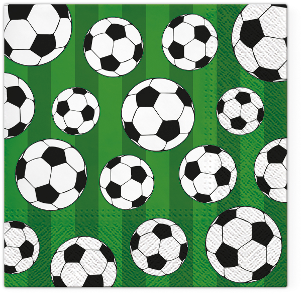 Vihreä raidallinen paperilautasliina jalkapallo kuviolla. Lautasliinan koko 33x33cm ja paketissa 20 kappaletta. Yhdistä lautasliinat Jalkapallo lautasten ja mukien kanssa.