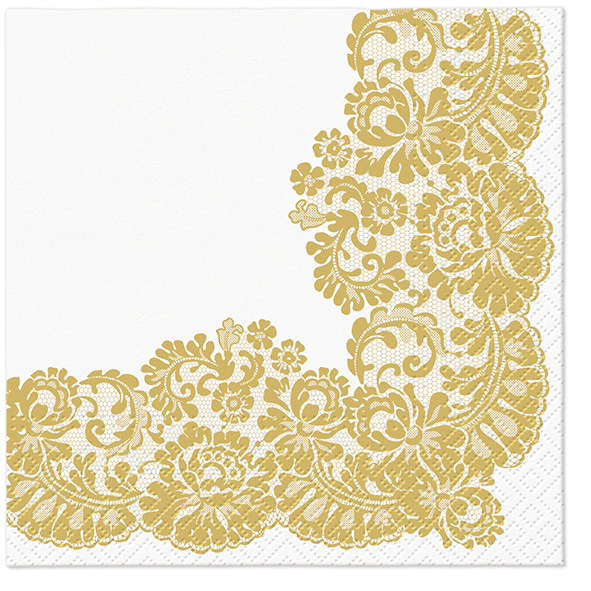 Valkoinen paperilautasliina kullanvärisellä pitsikuviolla. Lautasliinan koko 33x33cm ja paketissa 20 kappaletta. Yhdistä lautasliinat saman sävyisten lautasten ja mukien kanssa.