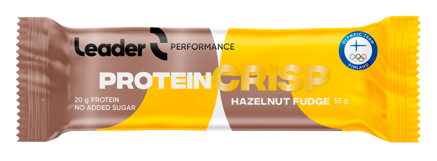 GluteenitonKotimainen Leader Performance Hazelnut Fudge on herkullinen hasselpähkinän ja kermakaramellinmakuinen proteiinipatukka sokerittomalla suklaakuorrutuksella ja rapeilla krispeillä. Patukka sisältää runsaasti proteiinia (20 g / patukka) eikä yhtään lisättyä sokeria tai palmuöljyä. Se soveltuu erinomaisesti välipalaksi, herkutteluun sekä proteiinilisäksi ennen tai jälkeen urheilusuorituksen. Tuote on gluteeniton ja valmistettu Suomessa. Patukan valmistuksessa on käytetty vastuullisesti tuotettua Rainforest Alliance-sertifioitua kaakaota.