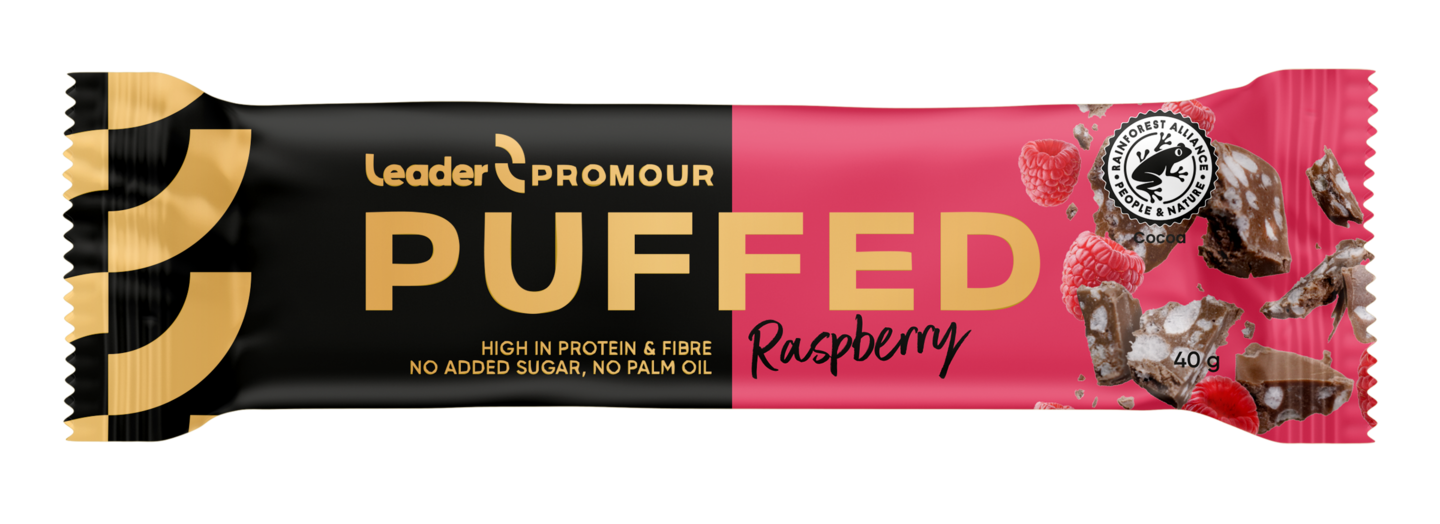 GluteenitonLeader Promour Puffed Raspberry on vadelmanmakuinen proteiinipatukka rapealla riisipuffilla, kuorrutettuna maitosuklaalla. Patukka sisältää runsaasti proteiinia ja kuitua eikä yhtään lisättyä sokeria tai palmuöljyä. Se sopii sekä terveelliseksi välipalaksi että herkutteluun vaikkapa kahvikupin ääressä. Promour patukoihin on valittu vastuullisesti tuotettuja raaka-aineita kuten Rainforest Alliance -sertifioitua kaakaota. Tuote on gluteeniton ja valmistettu Suomessa.