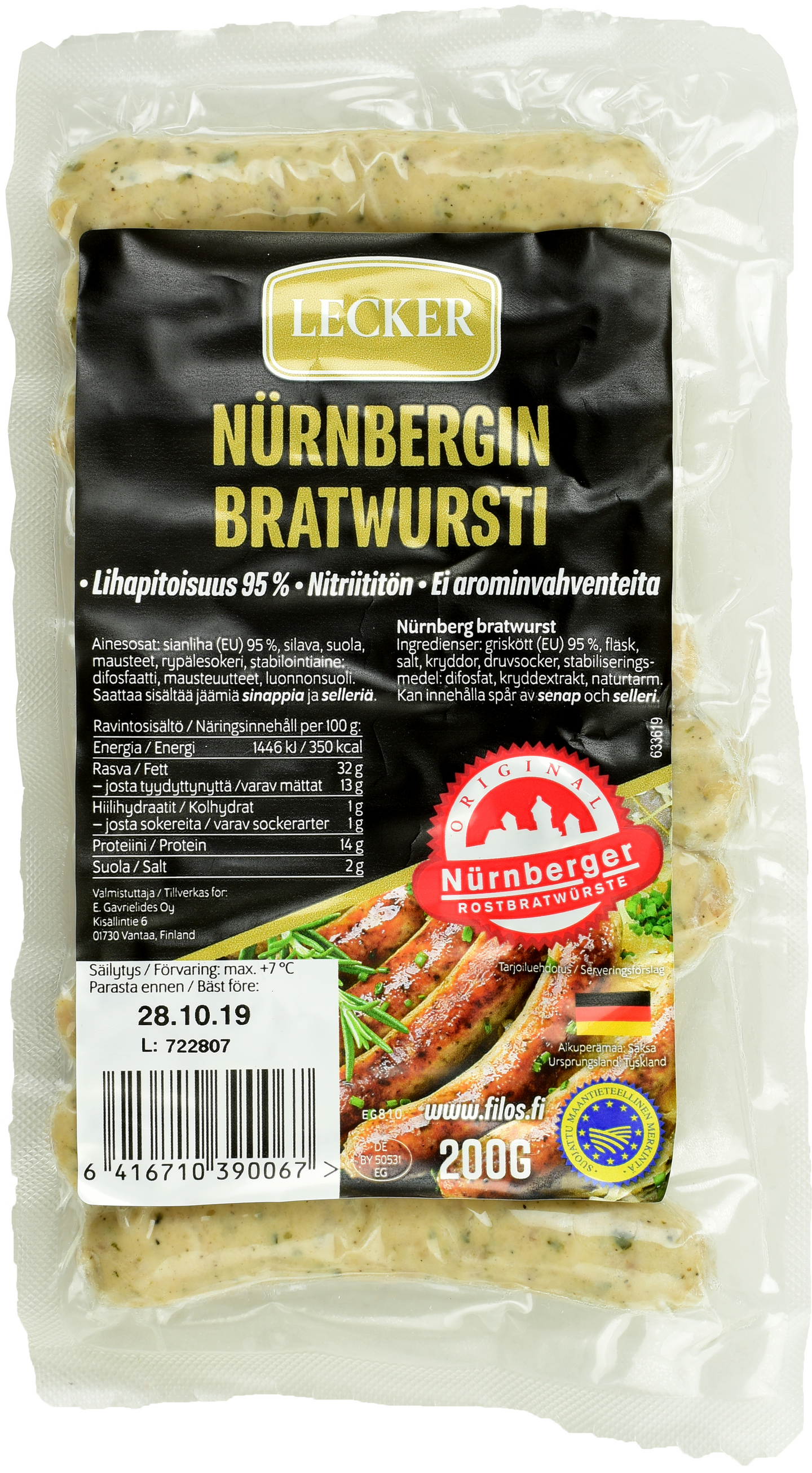 Aidot Lecker Nürnbergin bratwurstit ovat herkullisen mausteisia ja kypsyvät paistettaessa kauniin ruskeiksi. Nürnbergin bratwurstit valmistetaan Nürnbergin kaupungissa ja niille on myönnetty EU:n suojattu maantieteellinen merkintä. Nürnbergin bratwurstit valmistetaan perinteisellä reseptillä ja ovat tyypillisesti pienikokoisia.