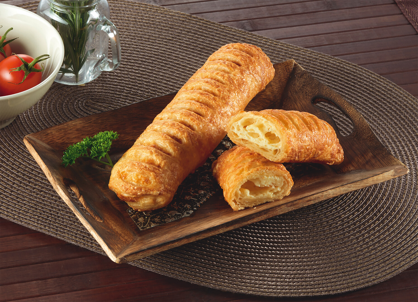 Lehtitaikinasta valmistettu esinostatettu rapea pakastesnack, jossa maukas kinkku-juustotäyte. Jäisenä paistovalmis. Pakkauskoko: 60 kpl x 105 g.
