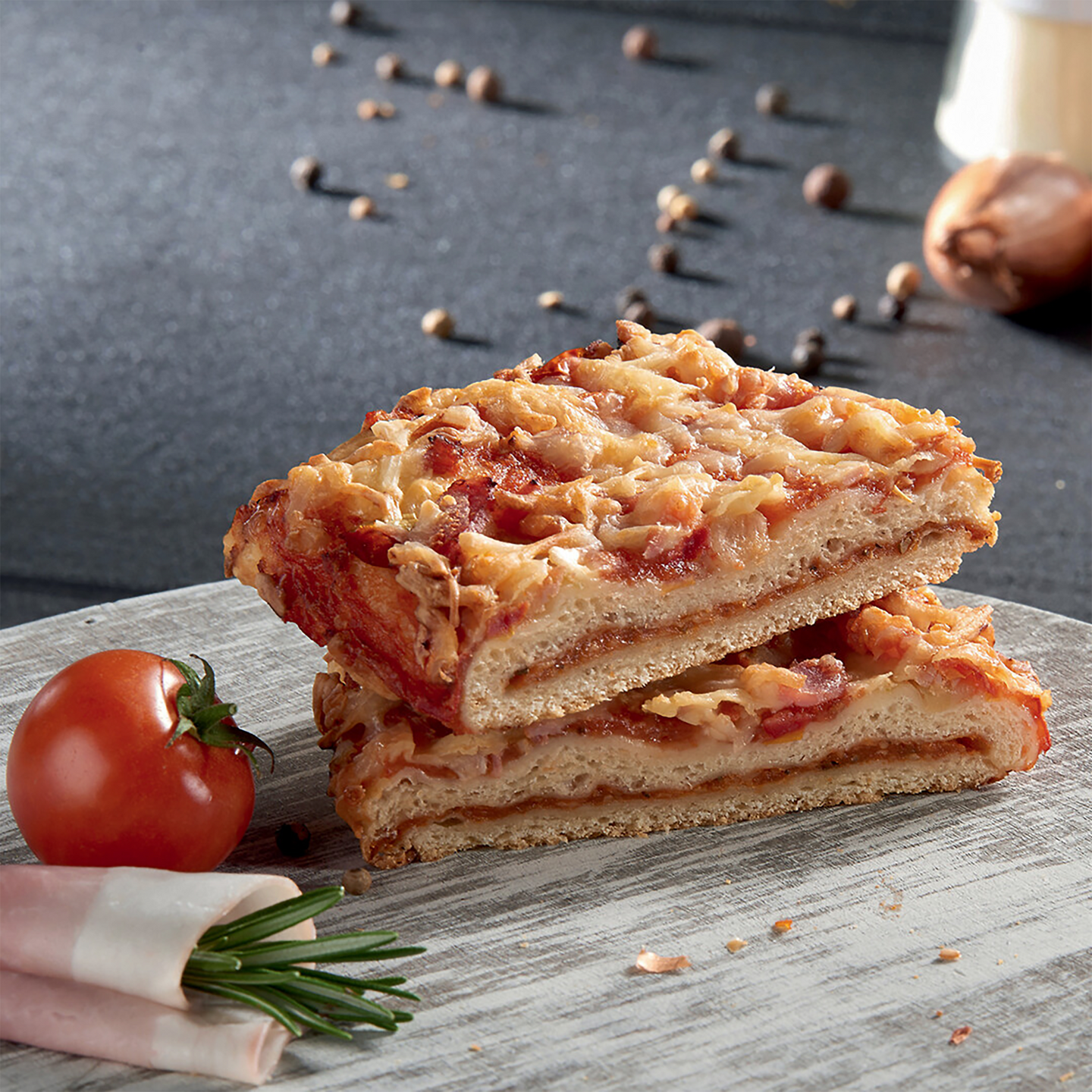 Paistovalmis täytetty pakastettu pizzaslice. Päällä herkullista kinkkua sekä sipulia ja välissä tomaattia sekä juustokastiketta. Jäisenä paistovalmis. Laatikossa 32 kpl 180 g:n pizzapaloja.