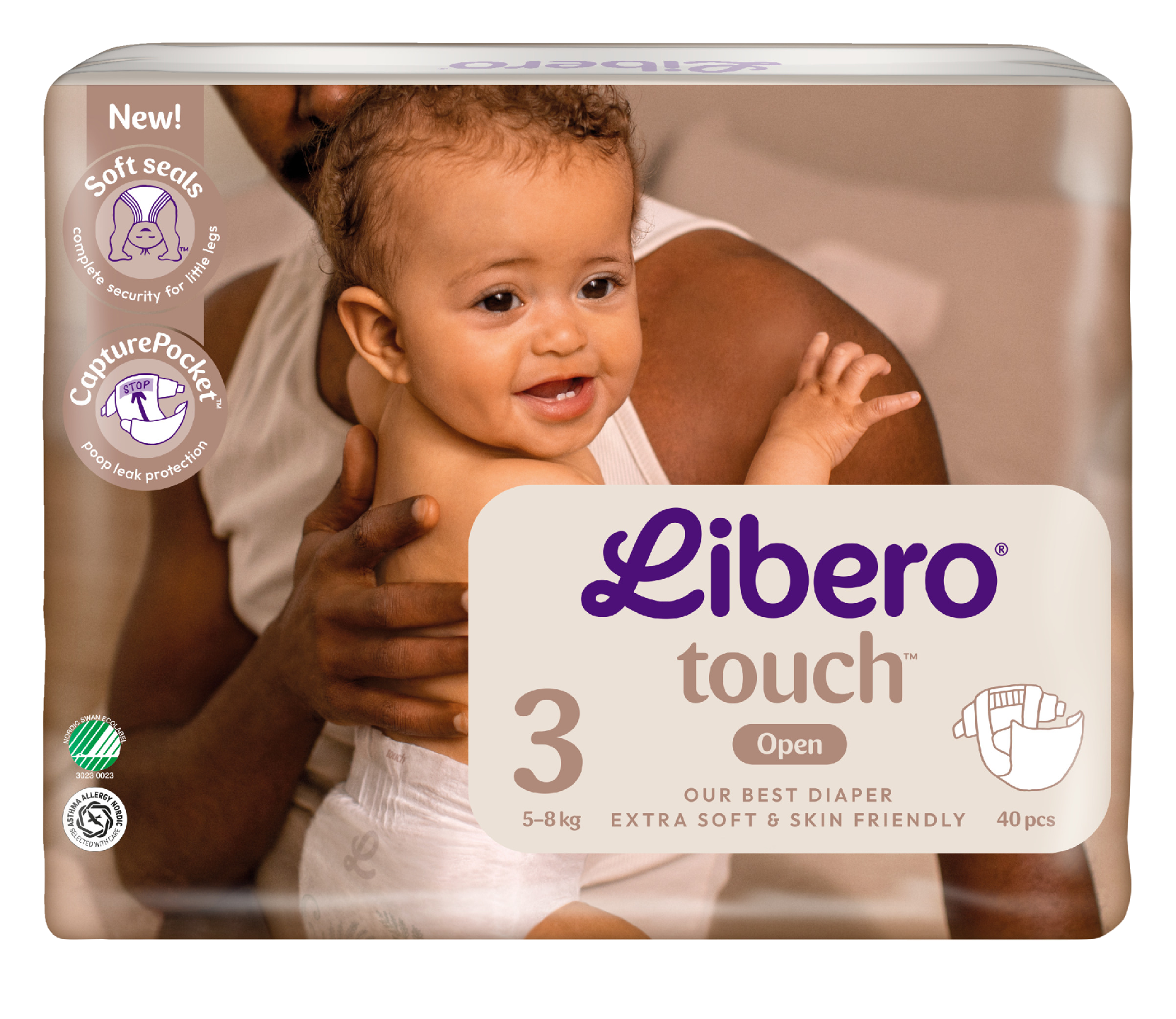 Libero Touch™ koossa 3 on Liberon pehmein, ohuin ja hellävaraisin vaippa – vauvoille, jotka painavat 5–8 kg. Lisäksi siinä on kätevä kosteusindikaattori. Libero pyrkii jatkuvasti vähentämään ilmastovaikutuksia – nyt vaippapakkauksissamme on 60 % kierrätettyä muovia ja uusiutuvien resurssien määrää lisätään tuotteidemme materiaalien valmistuksessa. Liberon vaippatehtaissa käytetään vain sertifioitua ja uusiutuvaa sähköä. Voiteettomat Libero Touch™ -vaipat ovat dermatologisesti testattuja, Joutsenmerkittyjä, Asthma Allergy Nordicin suosittelemia ja FSC-sertifioituja.