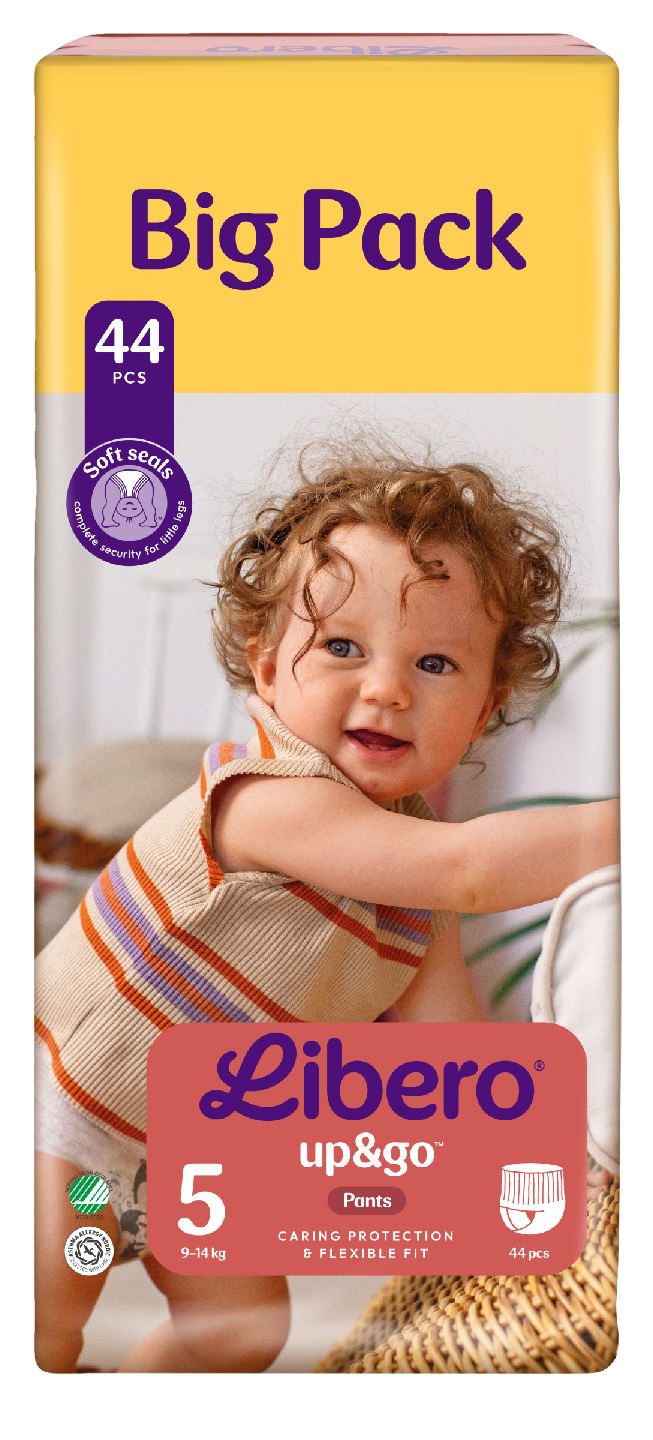 Libero Up&Go 5 -housuvaippa sopii pienokaisille, jotka alkavat liikkua enemmän ja painavat 9–14 kg. Pehmeä, luotettava ja täydellinen istuvuus. Pehmeä ja joustava vyötärö jokaiseen pieneen liikkeeseen. Soft seals -jalkaresorit - pehmeä, joustava istuvuus ja täydellinen suoja pienten jalkojen ympärillä. Kosteusindikaattori, joka näyttää, kun vaipassa on pissaa. Helppo ja kätevä vaipanvaihto: vedä vain sivut auki ja rullaa vaippa pieneksi paketiksi. Vuotosuojaa jopa 12 tunnin ajan kanavilla varustetun huippuimukykyisen ytimen ansiosta. Asthma Allergy Nordicin suosittelema ja Joutsenmerkitty.