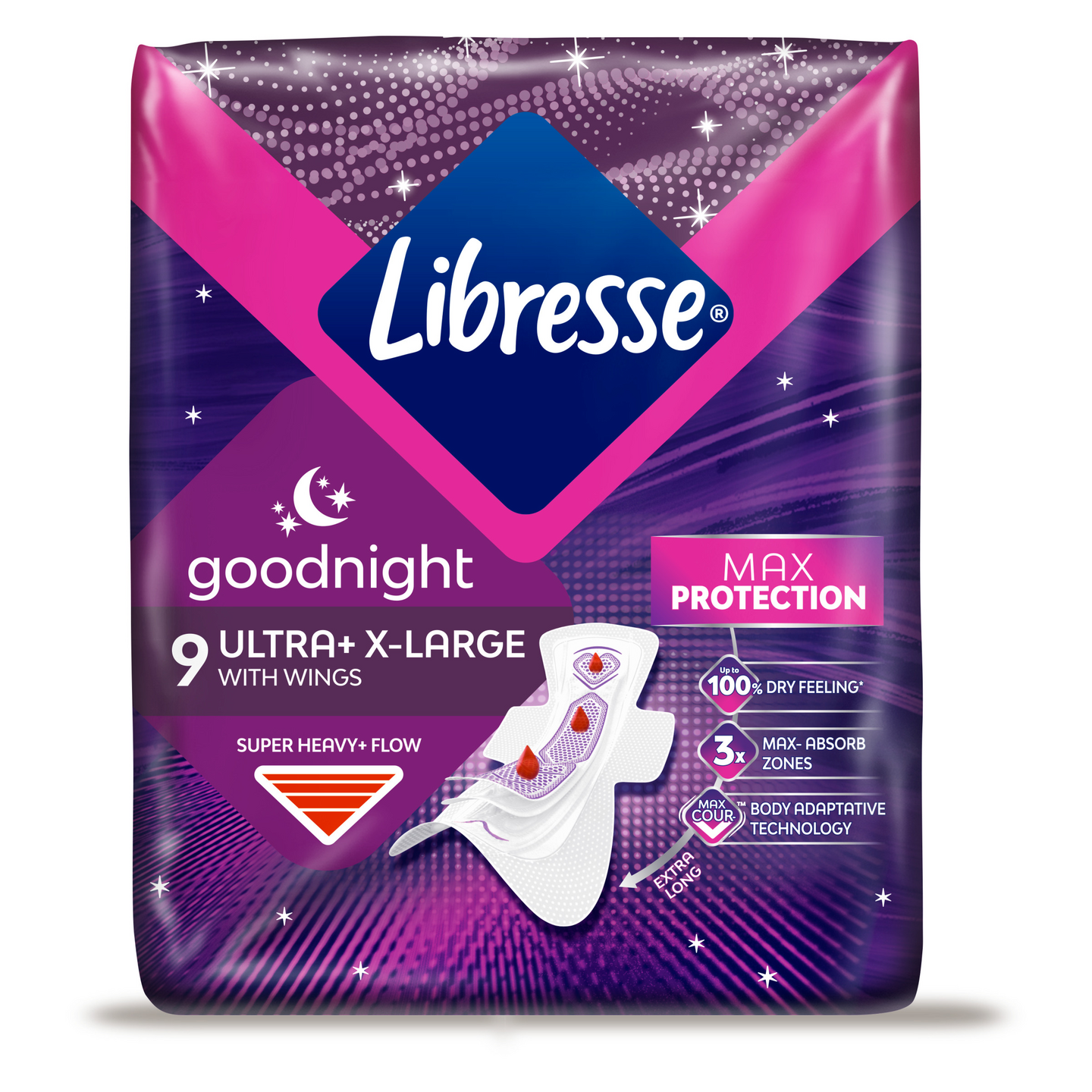 Siivekkeellisissä yösiteissämme on uusi kehon liikkeisiin mukautuva Max Cour-V -teknologia, joka takaa maksimaalisen suojan kuukautisten aikana. Goodnight Ultra Extra Large -siteet sopivat runsaaseen vuotoon ja tarjoavat suojaa läpi yön. Edestä ja takaa levennetty side sekä kaksikanavaiset imualueet takaavat maksimaalisen suojan, missä tahansa nukkumisasennossa, eikä ohivuotoja pääse syntymään Tuote on dermatologisesti testattu ja hajusteeton.
