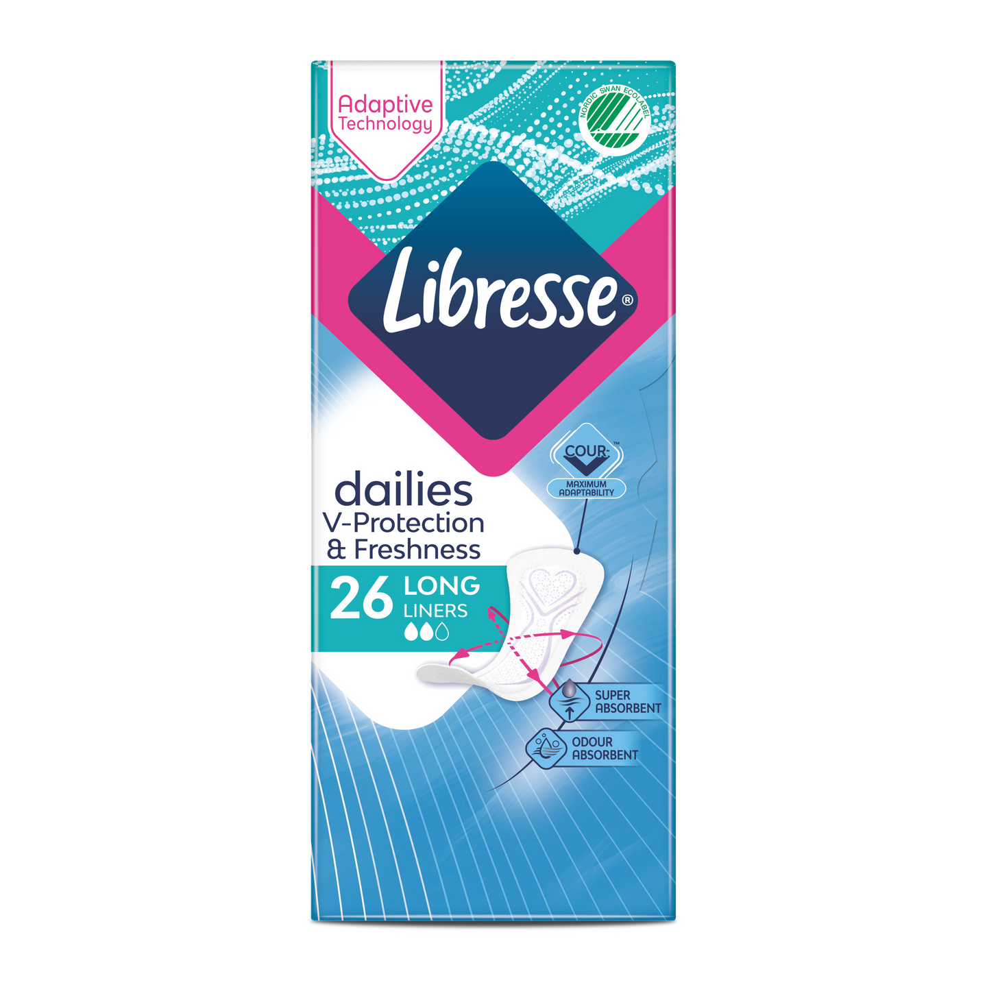Imukykyiset Libresse Dailyfresh Long -pikkuhousunsuojat ovat hieman pidempiä lisäten näin varmuutta ja suojaa. Daily Fresh -pikkuhousunsuojat ovat yhtä hengittäviä kuin puuvillaiset alushousut ja pitävät olosi raikkaana. Libresse DailyFresh -pikkuhousunsuojat sisältävät ProSkin-koostumuksen ja niissä on pH-tasapainotettua uutetta, joka pitää intiimialueen ihon pH:n tasapainossa. CurveFit™ muotoilun sekä erilaisen etu- ja takaosan ansiosta se mukailee intiimialueesi muotoja ja takaa mukavuuden koko päiväksi. Päivittäistä suojaa, joka pitää olosi kuivana ja raikkaana. Dermatologisesti testattu ja hajuteeton.