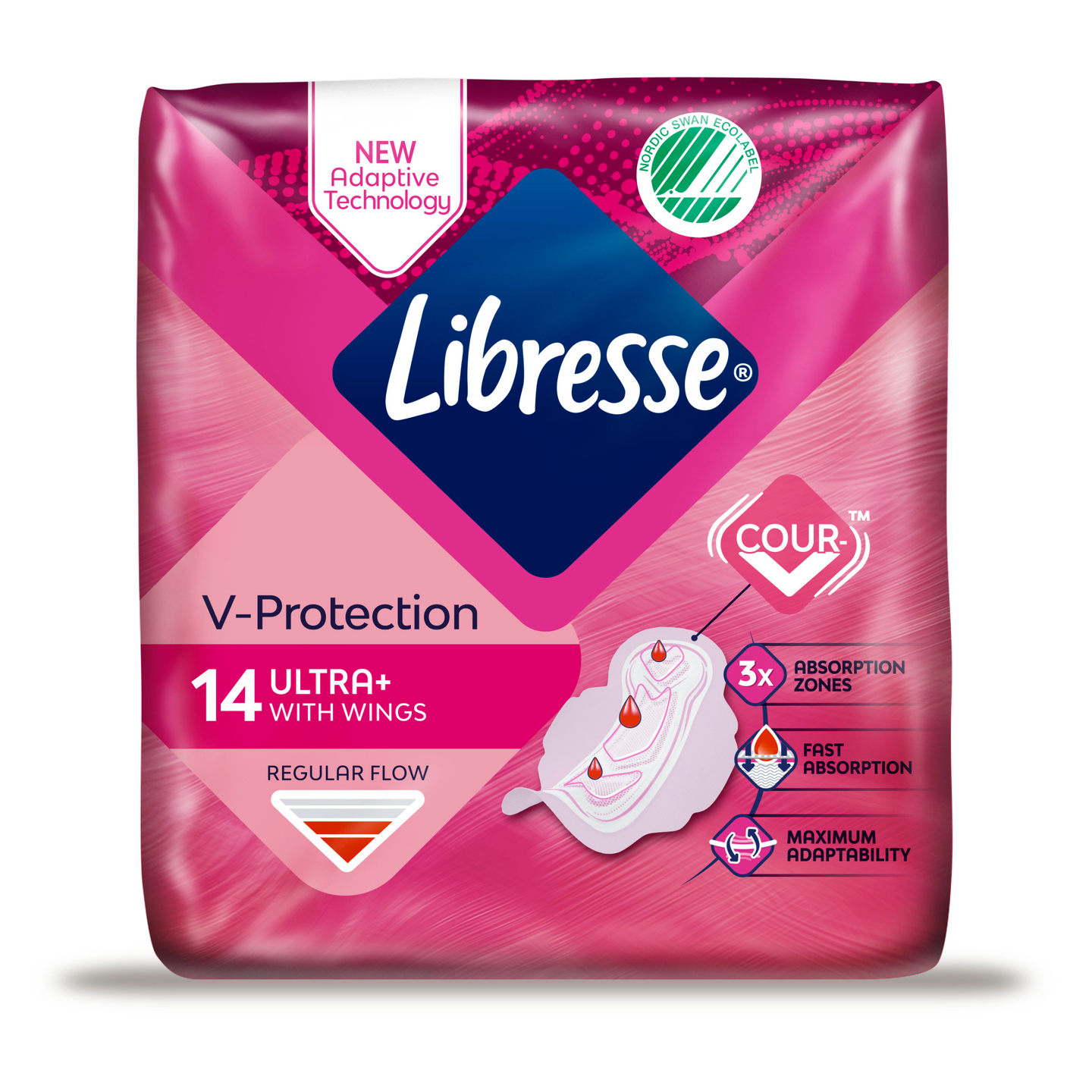 Siivellisissa Libresse V-protection Ultra+ -siteissämme on käytetty Cour-V™ -teknologiaa. Tuloksena on huippumiellyttävä joustava side, joka mukautuu kehoosi. Lisäksi pehmeiden siivekkeellisten siteiden kolme imuvyöhykettä imevät veren itseensä välittömästä ja pitävät V-zonesi raikkaana ja suojattuna koko päivän. Tuote on dermatologisesti testattu ja hajusteeton.