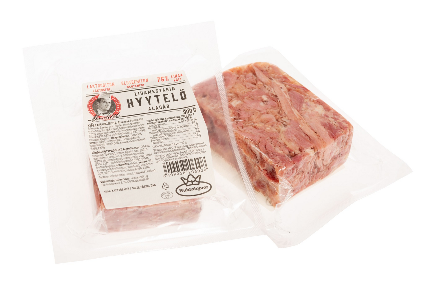 sianliha (alkuperä: Suomi), vesi, liivate (sika), jodioitu suola, aromit,stabilointiaine (E450, E451), hapettumisenestoaine (E326, E300), sokeri, dekstroosi, mausteet (lipstikka, paprika), säilöntäaine (E262, E250).