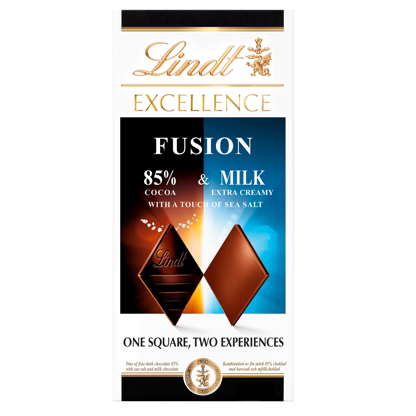 Koe Lindt EXCELLENCE FUSION; uusi makuelämys, jossa jokaisessa palassa yhdistyy kaksi erityyppistä suklaata. Lindt Suklaamestarimme ovat nyt luoneet asiantuntemuksellaan ja taidokkuudellaan uuden ohuen suklaalevyn, joka muodostuu kahdesta erilaisesta suklaakerroksesta: toinen kerros on tummaa suklaata ja toinen on sileää maitosuklaata. Tämä yllättävä suklaaherkku muuttaa yksittäiset ainesosat kiinnostavaksi yhdistelmäksi, joka luo uudenlaisen makuelämyksen. Lindt EXCELLENCE FUSION suklaalevyjä on kaksi erilaista: 70% tumma -ja maitosuklaa sekä 85% Merisuola tumma suklaa ja maitosuklaa. Nauti Lindt EXCELLENCE FUSION: Yksi suklaapala, kaksi makuelämystä.
