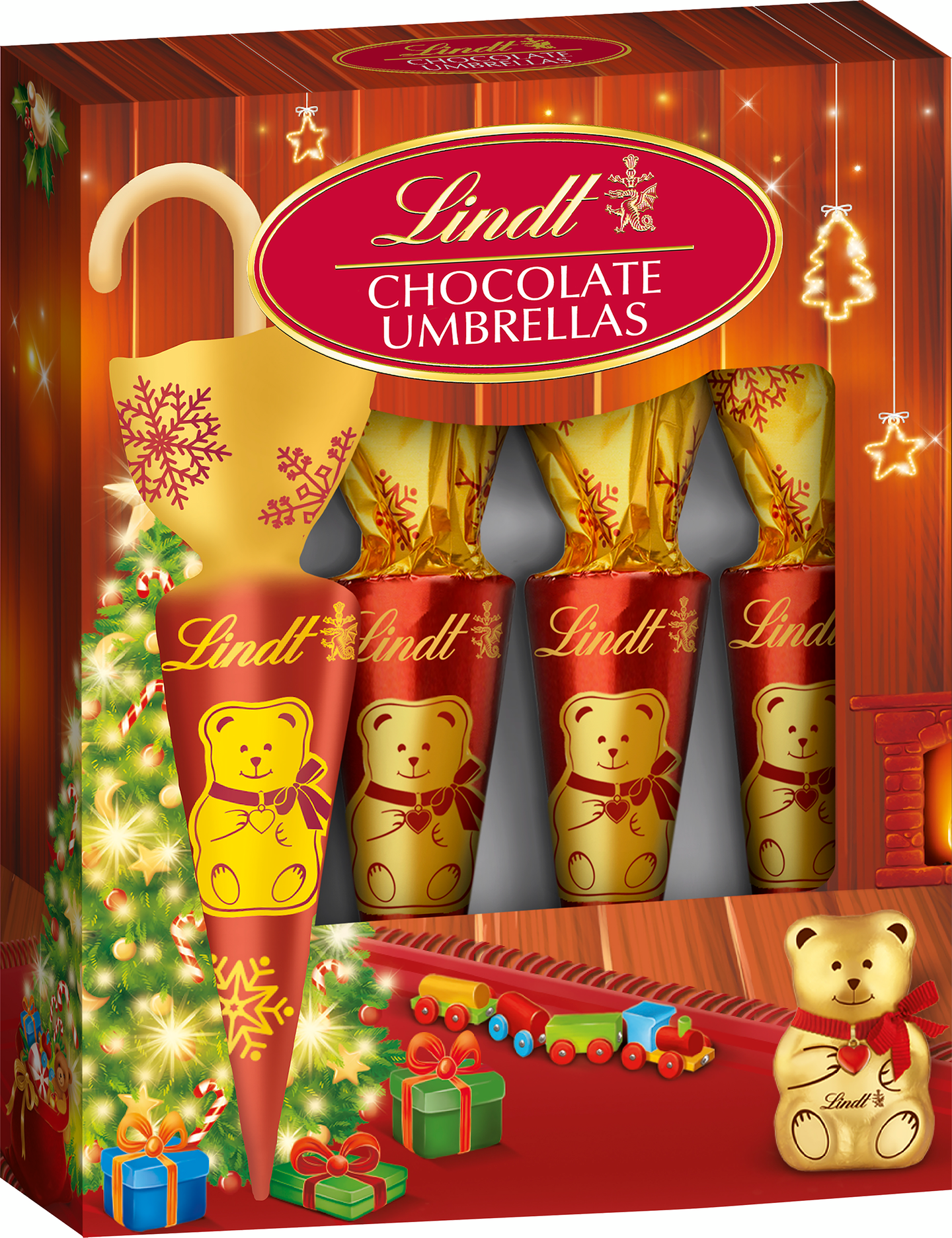 Joka joulu Lindt TEDDY toivoo paljon leikkimistä lumessa. Lindt TEDDY suklaiset sateenvarjot ovat yhtä hyviä kuin koristeellisia. Suklaa on valmistettu hienoimmasta maitosuklaasta. Sopii lahjaksi lapsille ja lastenlapsille tai ripustettavaksi joulukuuseen.