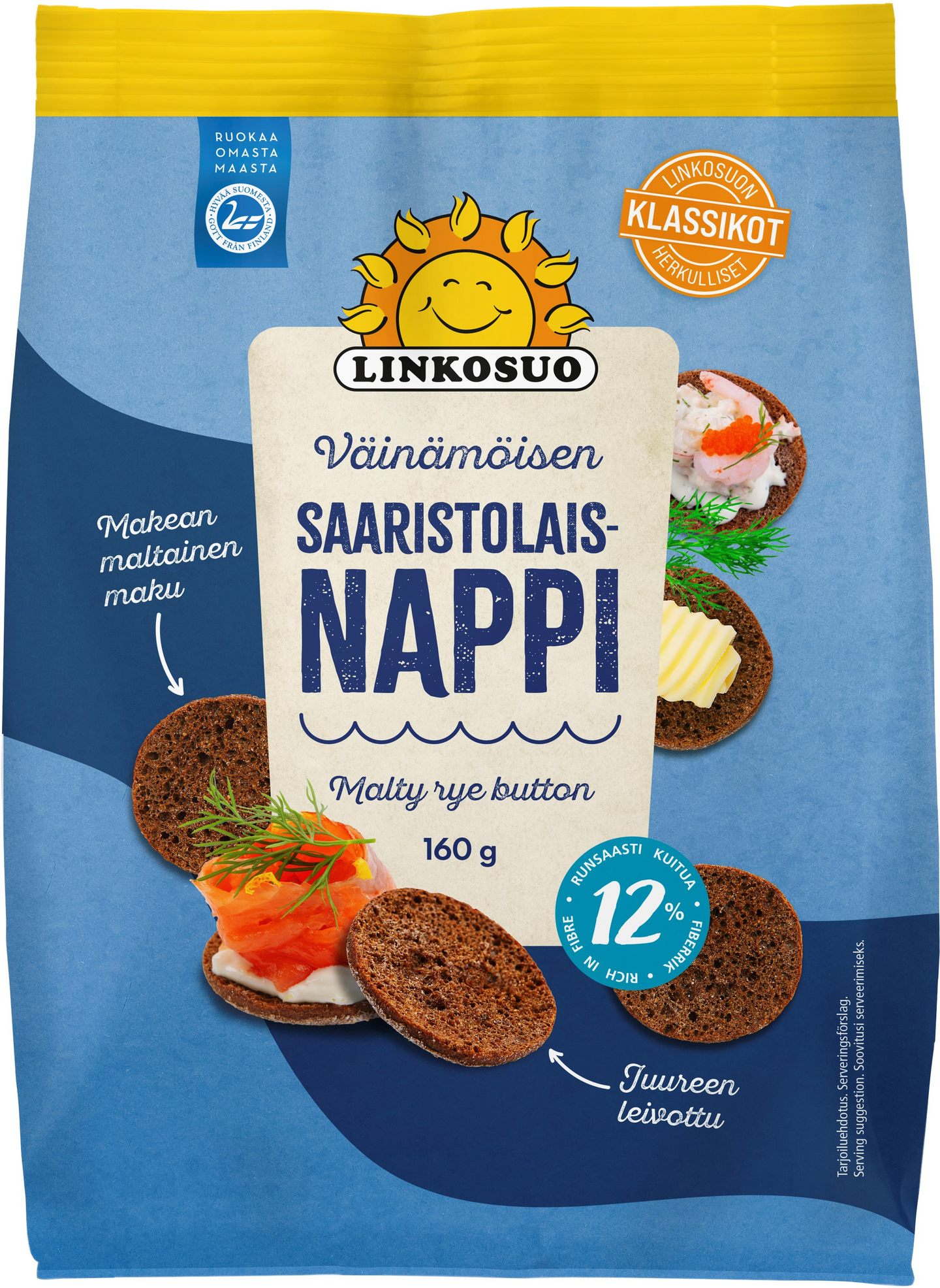 VegaaninenVäinämöisen Napit ovat Linkosuon klassikkotuotteita, jotka ovat vakiinnuttaneet paikkansa kuivaleipähyllyissä ja suomalaisten sydämissä. Maista nyt uusi makean maltainen Väinämöisen Saaristolaisnappi – sopii täydellisesti tarjottavaksi juhlissa cocktail-palana tai pienenä hiukopalana lempilevitteesi kanssa.