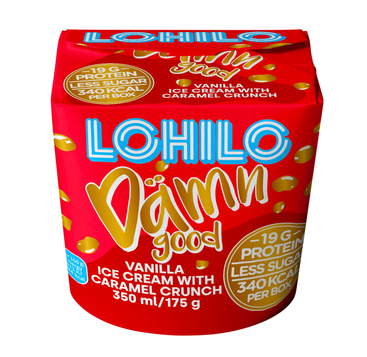 Vaniljanmakuista proteiinijäätelöä, jonka seassa rapeita karamellipaloja ja päällä herkullinen suklaakuorrute, vähälaktoosinen. Lohilo proteiinijäätelöt sopivat niin välipalaksi kuin herkutteluunkin. Vähemmän sokeria, enemmän proteiinia, herkullisesta mausta ja pehmeästä koostumuksesta tinkimättä.