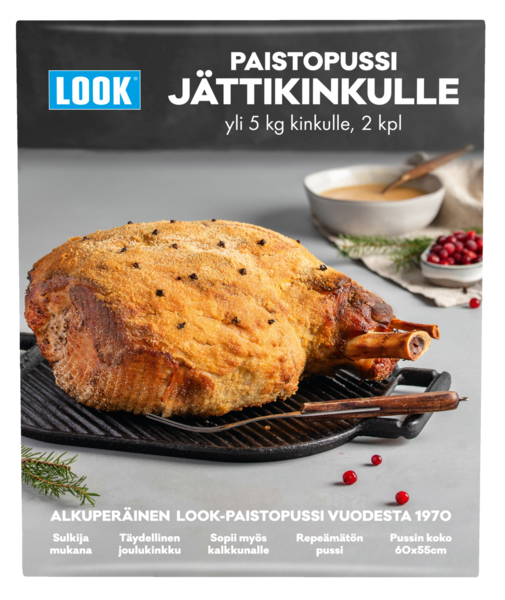 LOOK® paistopussi jättikinkulle paistat yli 5 kg kinkun tai kalkkunan tasaisesti ja lopputulos on mehukas. Vältät rasvaroiskeet ja uuni säilyy puhtaana. Saat talteen maukkaan paistoliemen, josta voit valmistaa herkullisen kastikkeen. LOOK® paistopussi valmistetaan ainutlaatuisesta repeämättömästä muovikelmusta, joka on suunniteltu erityisesti ruoanvalmistusta varten. LOOK® paistopusseja voidaan käyttää myös pakastuksessa ja ne soveltuvat myös mikroon. Pakkauksessa on 2 pussia ja pussinsulkijaa. Pussin koko 55 x 60 cm