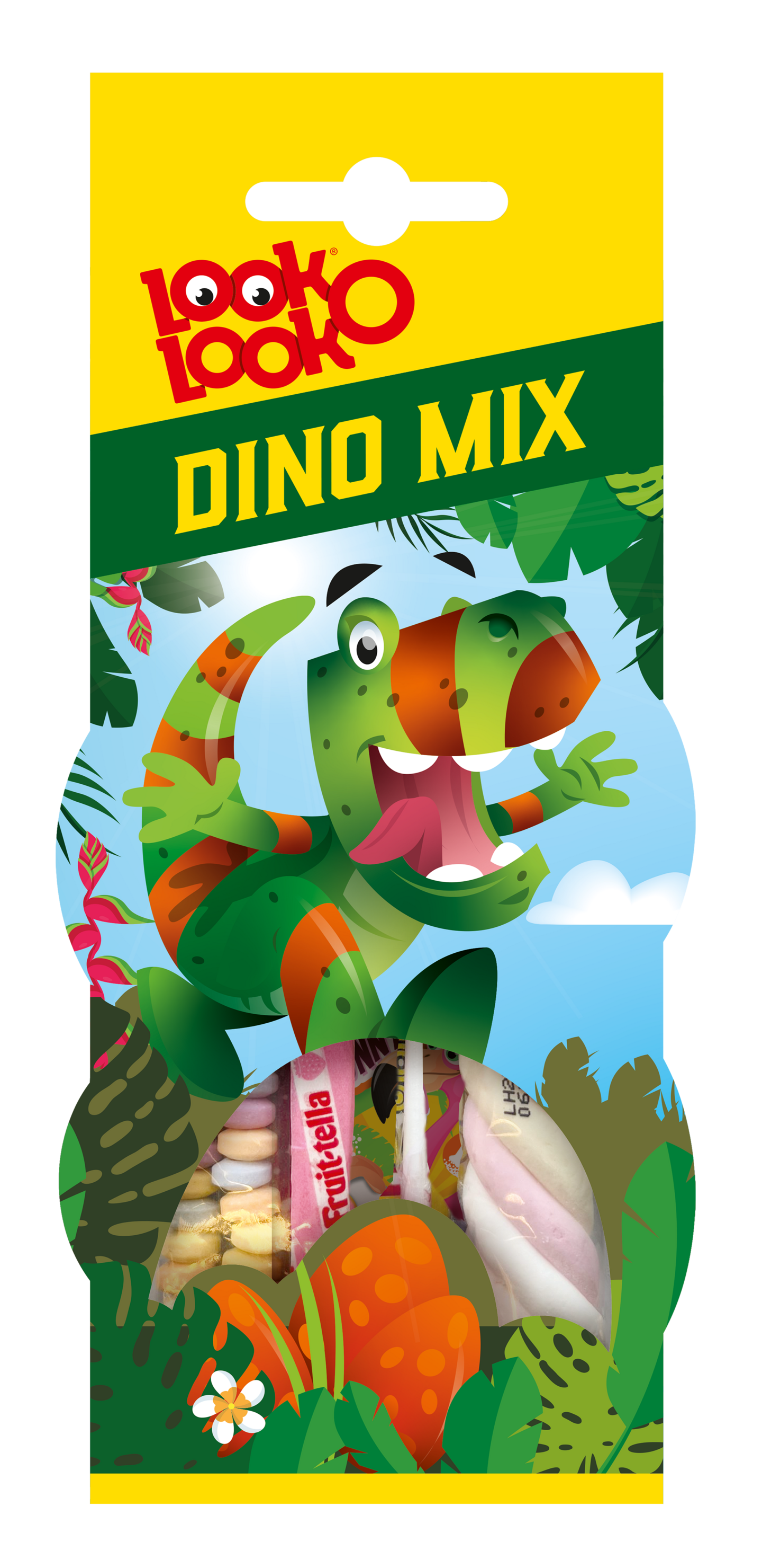 Look-O-Look Dino Mix sisältää erilaisia makeisia muun muassa tikkareita sekä vaahtomakeisia.