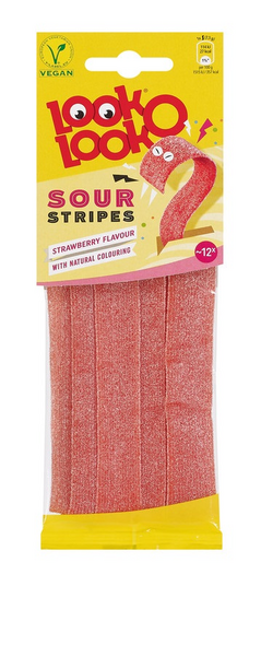 VegaaninenLook-O-Look perheen uusin tulokas Sour Stripes Strawberry on herkullisen kirpeä mansikanmakuinen makeisnauha. Pakkaus sisältää makeisnauhoja 16 kappaletta.