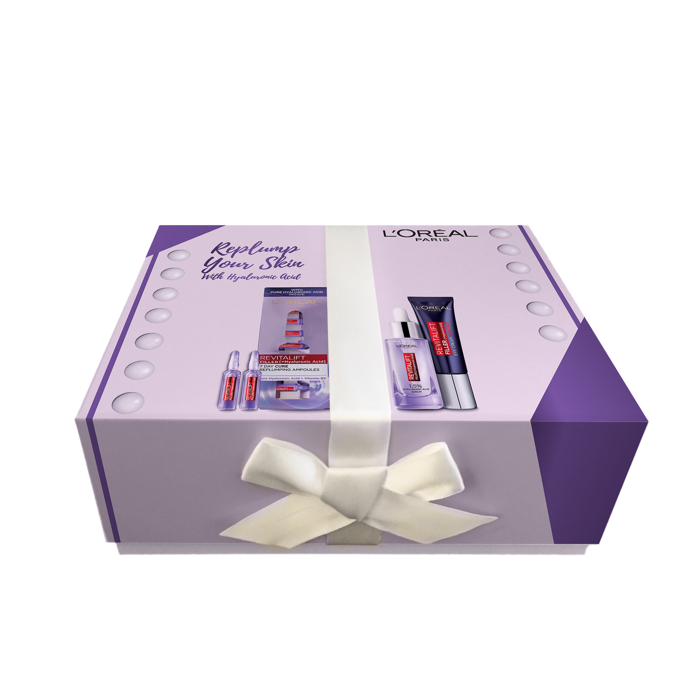L'Oréal Paris Revitalift Filler -lahjapakkaus sisältää Revitalift Filler Eye Cream For Face -silmänympärysvoiteen koko kasvoille, Revitalift Filler seerumin ja Revitalift Filler 7-päivän ampullikuurin. L'Oréal Paris Revitalift Filler -sarja täydentää ihoa kosteudella ja koostumukset sisältävät hyaluronihappoa.