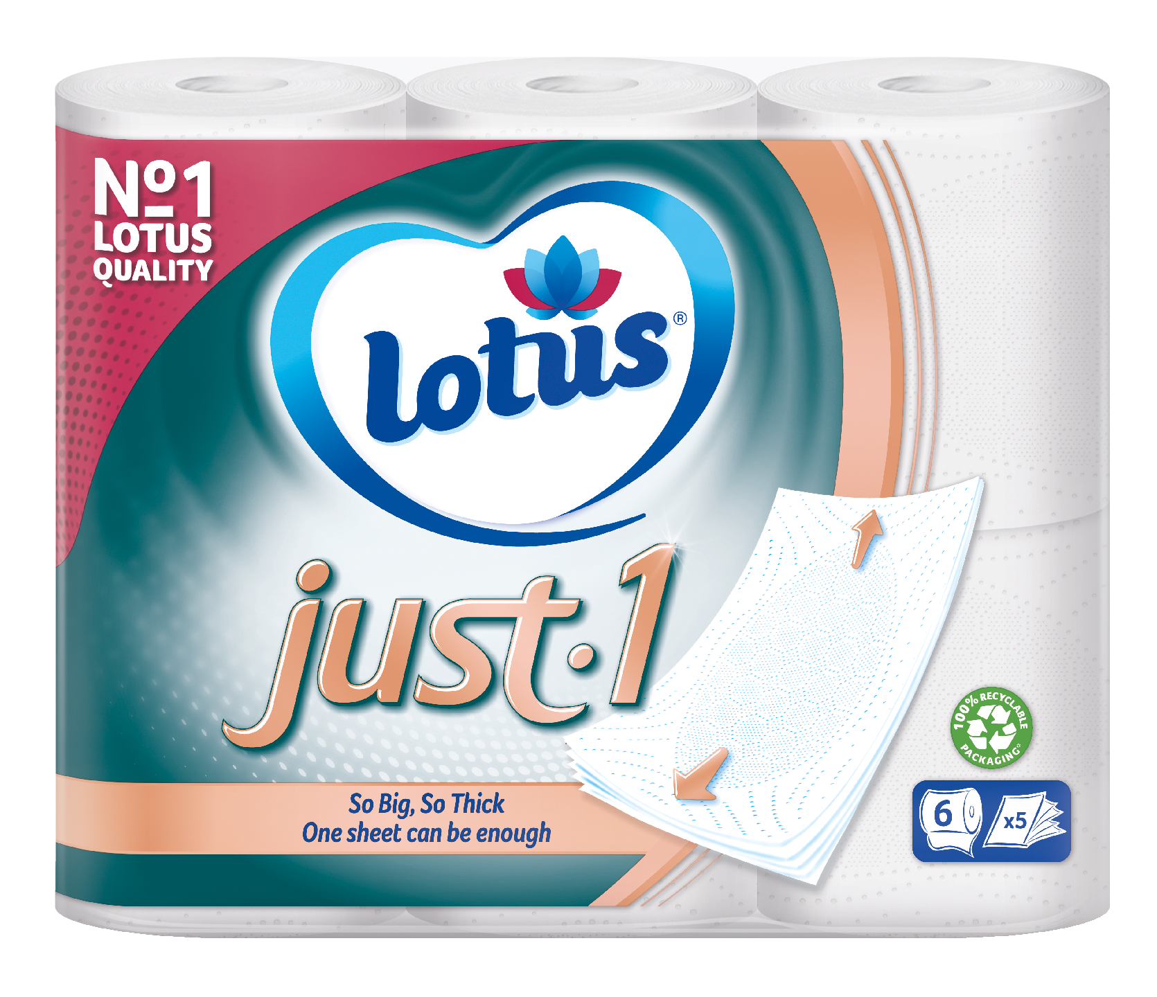 Lotus Just 1 -wc-paperissa on perinteisen kolmen paperikerroksen sijasta peräti viisi kerrosta paperia. Enää wc-paperia ei tarvitse taitella, vaan todellakin yksi tavallista suurempi, pehmeä ja kestävä Lotus Just 1 -arkki voi riittää. Lotus Just 1 -wc-paperirullissa on Flush&Go® -hylsy, jonka voi kierrättää, kompostoida ja huuhtoa alas vessasta. Flush&Go® hajoaa veteen kuten wc-paperi, 100-prosenttisella varmuudella. Kuituraaka-aine selluloosa. Kierrätettävä pakkaus.