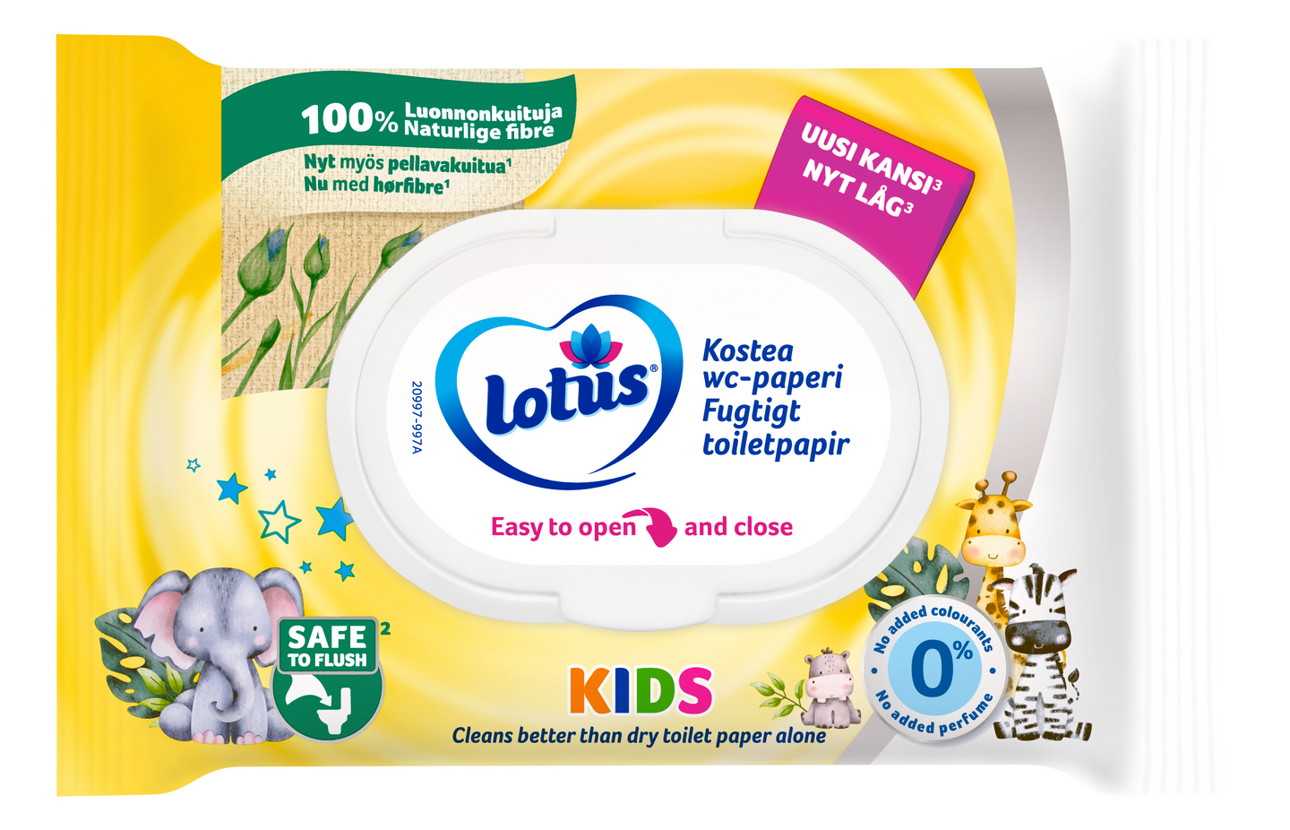 Lotus Kids Kostea wc-paperi puhdistaa tehokkaasti ja on hellä iholle. Nämä dermatologisesti testatut ja huuhdottavat arkit ovat pH-ihoneutraaleja, eikä niihin ole lisätty väriaineita eikä hajusteita. Lisäksi niiden kierrätettävässä pakkauksessa on suojaava ja helppokäyttöinen kova kansi, joka pitää ne kosteina ja hygieenisinä. Valmistettu FSC-sertifioidusta 100% luonnonkuidusta, Lotus kosteat wc-paperiarkit on suunniteltu ympäristöä kunnioittaen.