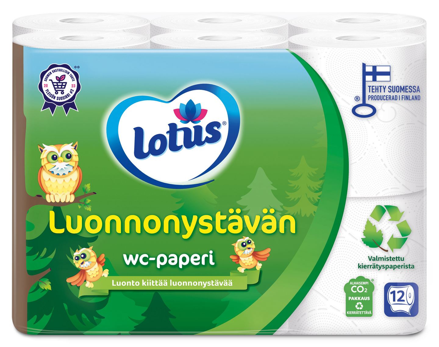 Luontokin kaipaa huomiota ja huolenpitoa. Lotus Luonnonystävän wc-paperi valmistetaan kierrätyspaperista. Pehmeä sinulle, pehmeä luonnolle. Kierrätyspaperista valmistettu wc-paperi on hieman tummempi sävyltään kuin uudesta kuidusta valmistettu wc-paperi. Lotus Luonnonystävän wc-paperi on muiden Lotus wc-papereiden tavoin pehmeää, vahvaa sekä miellyttävä käyttää. Lotus Luonnonystävän wc-paperi on valmistettu Suomessa Nokian paperitehtaalla. Tuotteella on EU-ympäristömerkki. Valmistettu FSC-sertifioidusta kuidusta (kuituraaka-aine: kierrätyskuitu). Rullat on pakattu kierrätettävään pakkaukseen, joka sisältää vähintään 30% kierrätysmuovia pakkauksen hiilijalanjäljen pienentämiseksi. Luonto kiittää luonnonystävää.