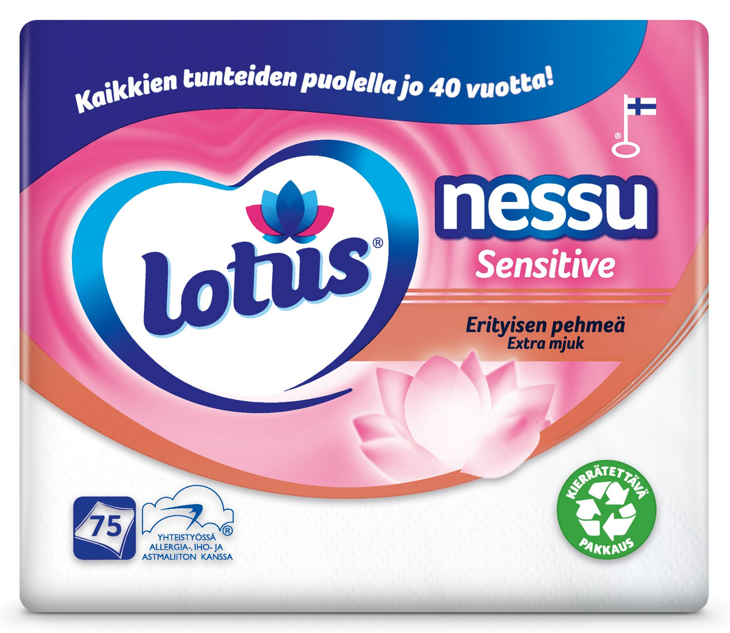 Lotus Nessu Sensitive -nenäliinat ovat erityisen pehmeitä, joten ne eivät ärsytä ihoa silloinkaan, kun joutuu niistämään usein. Nessu Sensitive nenäliinan valmistuksessa on kiinnitetty pehmeyden ohella erityistä huomiota myös vahvuuteen ja pölyämättömyyteen. Lotus Nessu Sensitive -nenäliinoilla on Allergia-, iho- ja astmaliiton myöntämä Allergiatunnus. Lotus Nessu Sensitive nenäliinat valmistetaan Suomessa Nokian paperitehtaalla. Tuotteella on EU Ecolabel -ympäristömerkki ja se on valmistettu FSC-sertifioidusta kuidusta (Kuituraaka-aine: selluloosa). Kierrätettävä pakkaus.