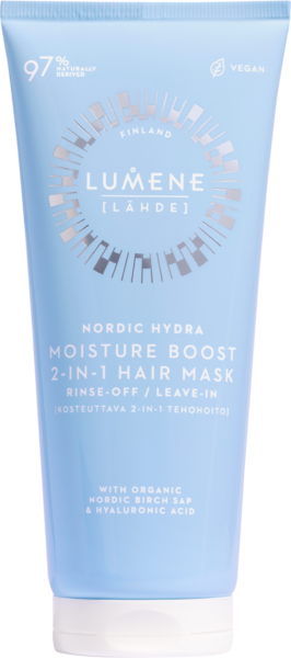 Ravitse hiuksiasi intensiivisellä kosteudella tyvestä latvoihin! LUMENE Nordic Hydra [Lähde] Moisture boost 2-in-1 hiusten tehohoito jättää hiukset kosteutetun, pehmeän ja kevyen tuntuiseksi ja saa ne näyttämään elinvoimaisilta. 97% luonnollista alkuperää oleva vegaaninen koostumus sisältää pohjoisen luomu koivunmahlaa, sekä hyaluronihappoa. Käytä poishuuhdeltavana, tai hiuksiin jätettävänä hoitotuotteena! Poishuuhdeltavana hoitotuotteena: levitä pestyihin hiuksiin, anna vaikuttaa 5 minuuttia ja huuhtele huolellisesti. Hiuksiin jätettävänä hoitotuotteena: levitä pieni määrä kosteisiin hiuksiin auttamaan hiusten selvitystä, tai levitä pieni määrä kuiviin hiuksiin silottamaan pörröisyyttä stailatessasi hiuksiasi.