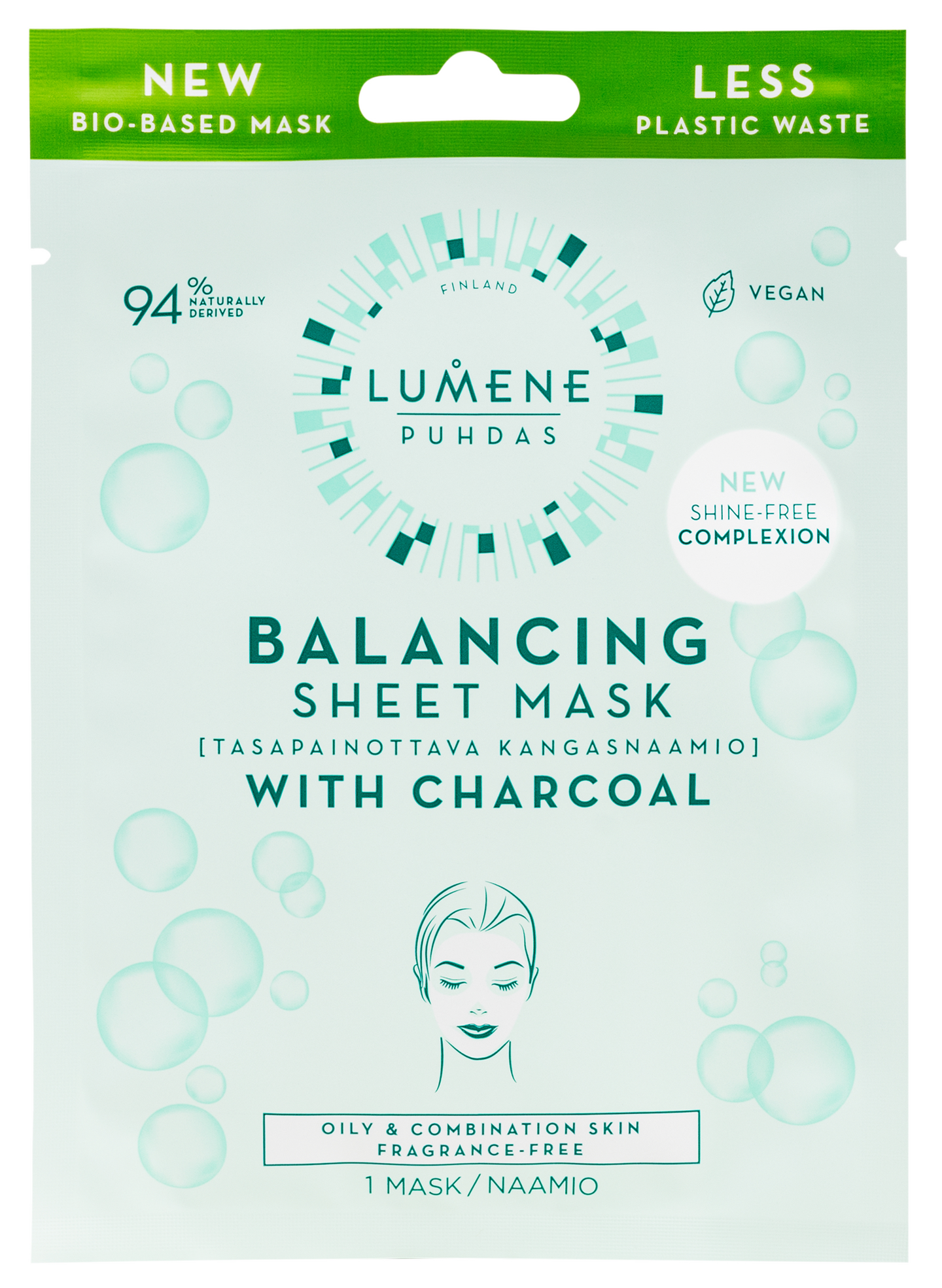 Lumene PUHDAS Tasapainottava kangasnaamio puhdistaa ja kosteuttaa ihoa jättäen sen mattapintaisen näköiseksi kangasnaamioon imeytyneen hiiltä sisältävän seerumin avulla. Selluloosapohjainen, biohajoava kangasnaamio auttaa aktiiviaineita vaikuttamaan iholla ja estää kosteuden haihtumista tasapainottaen ihoa ja hilliten sen öljyisyyttä. Virkistävä, hajusteeton koostumus hellävaraisella viilentävällä vaikutuksella sopii erityisesti rasvoittuvalle ja sekaiholle.