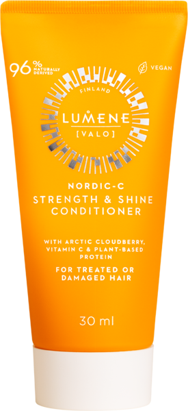 LUMENE [Valo] Nordic-C Vahvistava & kiiltoa antava hoitoaine hoitaa hiuksia ja hiuspohjaa tehden hiuksista hyvinvoivan ja kiiltävän näköiset. Se auttaa korjaamaan vaurioita, vahvistamaan hiuksia ja ehkäisemään hiusten katkeilua. Hiukset ovat helposti kammattavat, sileät ja pehmeät.