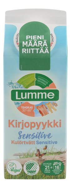 Lumme Kirjopyykki Sensitive on hellävarainen pyykin väreille ja tehokas jo 30 °C:ssa. Täysin hajusteeton ja väriaineeton. Sopii erityisesti hajusteyliherkille ja herkkäihoisille. Ympäristömerkityt Lumme-pyykinpesunesteet kuormittavat vähemmän ympäristöä tehokkaasta pesutuloksesta tinkimättä. Pyykinpesunesteen annostusmäärä on alhainen tiiviin koostumuksen ansiosta. Riittää jopa 21 pesukertaan normaalilikaista pyykkiä. Tuote on vegaaninen ja sille on myönnetty Joutsenmerkki. Tuote on pakattu hiilineutraaliin kartonkipakkaukseen, joka on valmistettu yli 90 %:sesti uusiutuvista raaka-aineista. Kierrätä pakkaus kartonkina ja korkki muovina.