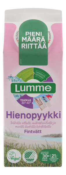 Lumme Hienopyykki on hellävarainen hienopesuneste herkille tekstiileille. Se sopii hyvin villalle, silkille, fleecelle, mikrokuidulle, neuleille, liinavaatteille, untuvalle ja muille hauraille vaatteille ja materiaaleille. Pesee tehokkaasti puhtaaksi jo 30 °C:ssa ja on hellävarainen tekstiileille ja ympäristölle. Pyykinpesunesteen annostusmäärä on alhainen tiiviin koostumuksen ansiosta. Riittää jopa 30 pesukertaan normaalilikaista pyykkiä. Tuote on vegaaninen ja sille on myönnetty Joutsenmerkki. Tuote on pakattu hiilineutraaliin kartonkipakkaukseen, joka on valmistettu yli 90 %:sti uusiutuvista raaka-aineista. Kierrätä pakkaus kartonkina ja korkki muovina.