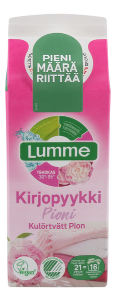Lumme Kirjopyykki Pioni on hellävarainen pyykin väreille ja tehokas jo 30 °C:ssa. Lumme Kirjopyykki Pioni antaa pyykille ihanan pioninkukan tuoksun. Ympäristömerkityt Lumme-pyykinpesunesteet kuormittavat vähemmän ympäristöä tehokkaasta pesutuloksesta tinkimättä. Pyykinpesunesteen annostusmäärä on alhainen tiiviin koostumuksen ansiosta. Riittää jopa 21 pesukertaan normaalilikaista pyykkiä. Tuote on vegaaninen ja sille on myönnetty Joutsenmerkki. Tuote on pakattu hiilineutraaliin kartonkipakkaukseen, joka on valmistettu yli 90 %:sesti uusiutuvista raaka-aineista. Kierrätä pakkaus kartonkina ja korkki muovina.