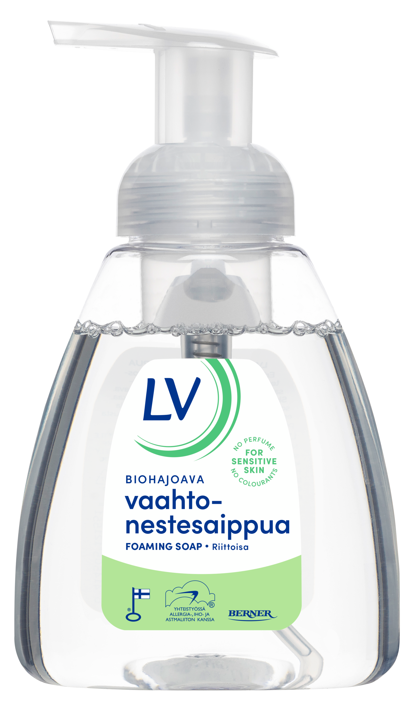 LV vaahtonestesaippuan pehmeä vaahto puhdistaa hellävaraisesti eikä kuivata ihoa. Sopii koko perheelle ja myös vartalon pesuun. Sisältää väkiviinaetikkaa, joka neutraloi tuoksuja eli tuote sopii myös keittiösaippuaksi. Hajusteeton ja väriaineeton. Kaikki LV-tuotteet tehdään yhteistyössä Allergia-, iho- ja astmaliiton kanssa, josta kertoo Allergiatunnus Käyttöohje: Hiero saippuavaahtoa käsiin kauttaaltaan, muista myös sormien välit ja kämmenselät, ja huuhtele
